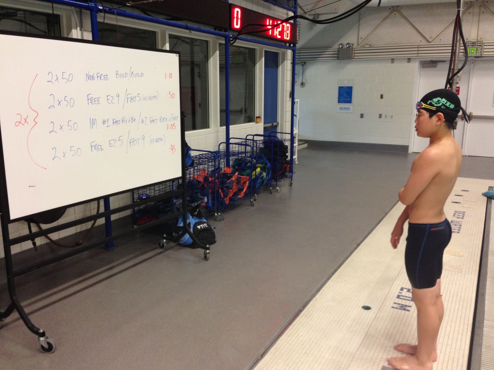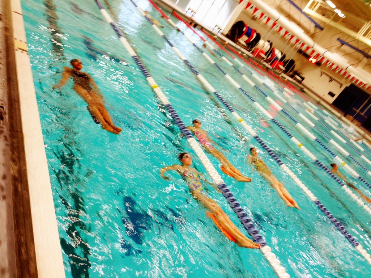 That night at practice I loosened things up with a birthday set in honor of Jordan featuring eighteen 50s. We then floated out to the middle of the pool for some vertical kicks and fly bobs. After a couple of rounds, I had them do a “team vertical kick” which involved them holding on to each other shoulder to should in a long line and kicking as a team to hold each other up. We did three rounds of this and they were challenged, but able to find a groove and make it work as one unit. Really cool to have these team building moments work out.
