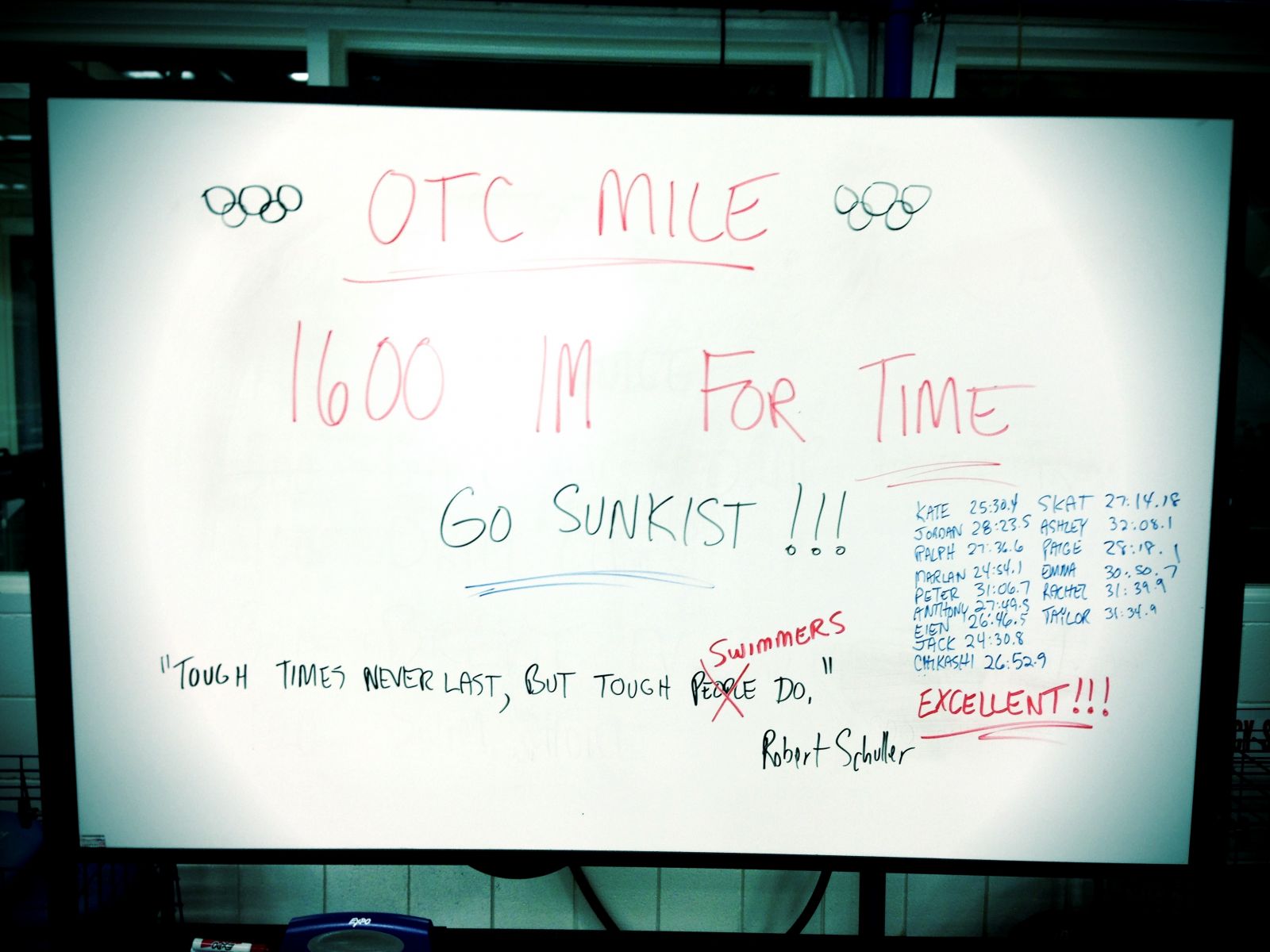 Our last practice was bitter sweet, no one wanted it to end. The meat and potatoes of the workout—the storm—was a 1600 IM for time which I dubbed THE OTC MILE. The groans and gasps dissipated a little when I told them the 1600 would be swum as four 400 IMs back to back, no stopping and no DQs. Our younger, weaker fliers would be doing eight 200 IMs back to back. It was sounding a little more reasonable to the group and soon they were gung-ho to tackle this puppy, if not just to get it over with. They all put the pedal down on The OTC Mile and every swimmer finished hard to the end. Was a long race, but they hung tough and they did it! We caught our breath with some recovery dolphin quarters then ended the workout with starts, working on a few of the things we learned in our workshops.