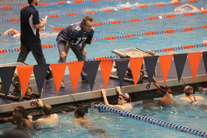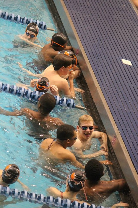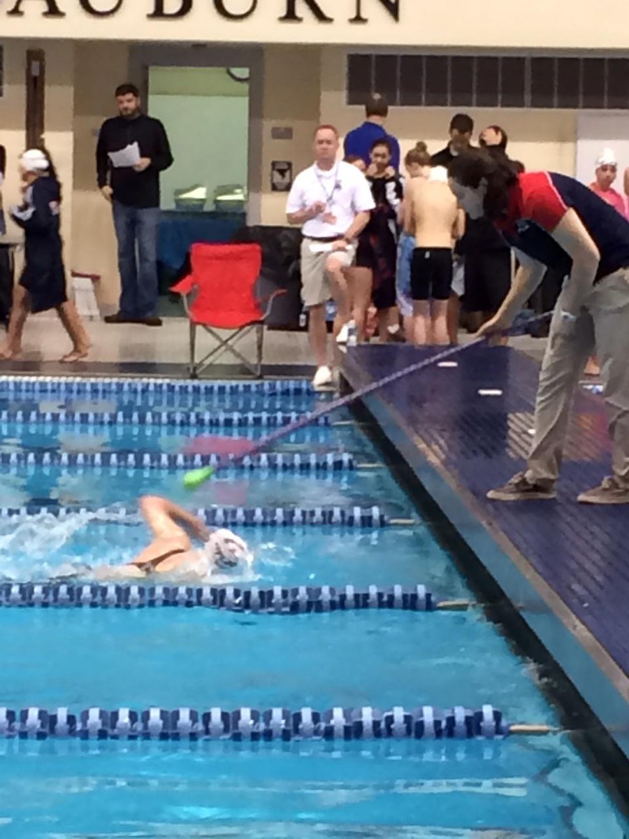 Swimmers were treated to see some super fast swims by a few Auburn college and post-grad swimmers, and especially priviledged to watch one brave swimmer who gave everything she had every time in the water, racing full speed to each wall—despite being blind. With the help of her coach and her mother, dutifully standing at each end of her lane with a long stick that had a tennis ball duct-taped to the end to tap her on the head just before each flip turn and the finish so she knew that the wall was coming, this gutsy young lady deserves Swimmer-of-the-Meet honors for not letting her disability get in the way of her desire to achieve. You may think you have it bad when your goggles fill up with water during a race or when they unexpectedly fly off altogether, try swimming completely blind lap after lap at full speed with complete faith and trust in your team to be there for you at the walls—that is what SWIMYAH is all about: swimming with intensity, mastery, yearning and heart. That is what TEAM work is all about: together everyone achieves more. She was simply amazing.
