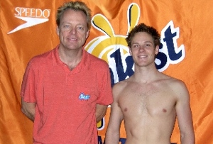 OLYMPIC SWIMMER Gil Stovall poses with coach David Orr at the pool on May 8th. “Saturday, we saw firsthand what an amazing swimmer he is—and what a great guy! After practice he was gracious enough to take pictures and sign autographs. Good news, he said he will come back and work out with us again."