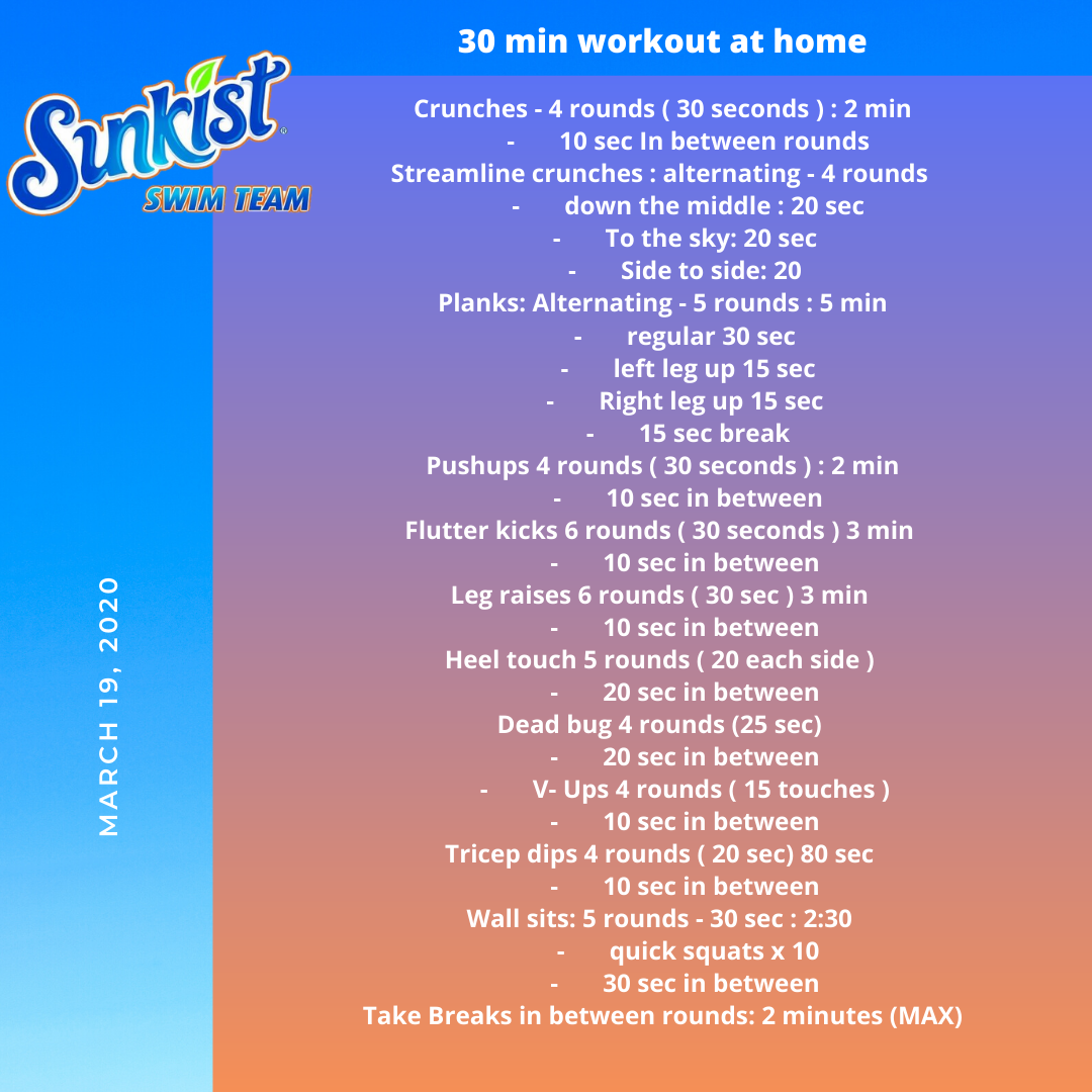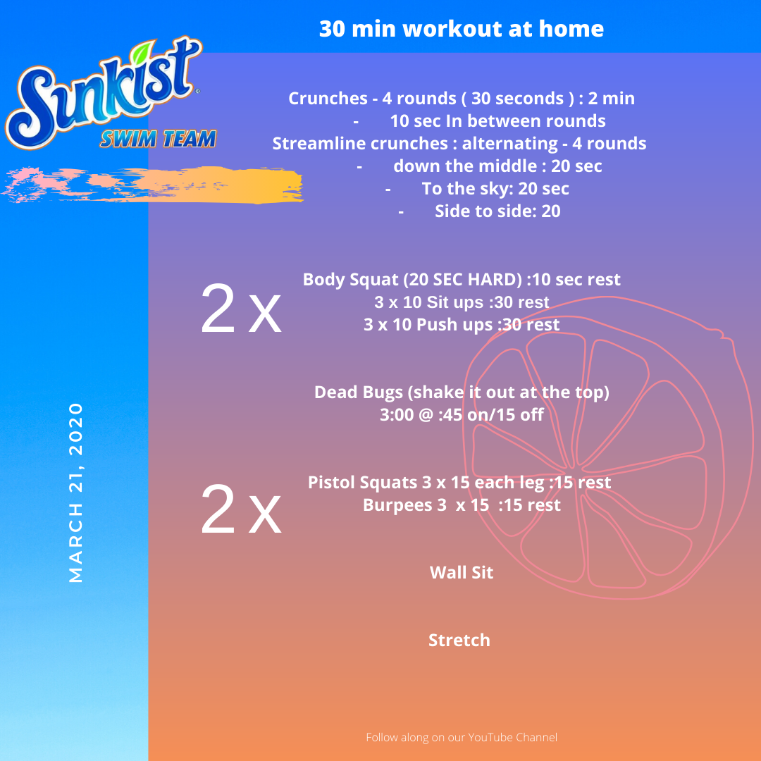 Sunkist will be providing some at home workouts for our swimmers (please remember to follow all CDC guidelines regarding social distancing while working out). Please remember, proper form is the most important element. It is far better to complete an exercise correctly than 20 times incorrectly. These dryland workouts can and will need to be adapted to fit each swimmer’s skill set and individual ability. Please have your swimmer focus on learning the proper form of each exercise. There dryland sessions live now on our YouTube page.