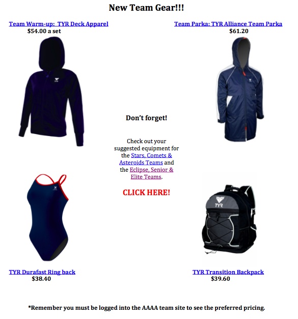 Just a short reminder that the new AAAA team suits, warm-ups, parkas and backpacks are now available in your team store.  We have put together a terrific team apparel package!