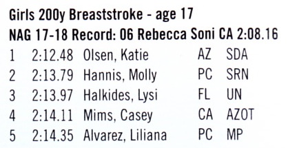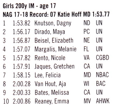 As noted in Splash Magazine, Emma had the 10th fastest 200IM swim in the nation with a time of 2:00.86.  She also had the 10th fastest time in the 200 Breaststroke with a time of 2:15.84.  Check out the results below and see all the age groups in this month's edition of Splash.
