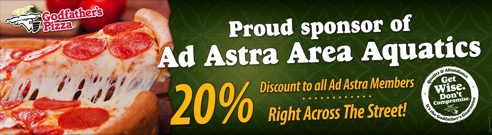 In addition, all Ad Astra families will receive a 20% discount on their bill when dining with GodFather’s. After all, it is right across the street from the pool. What better spot to dine out after workout.