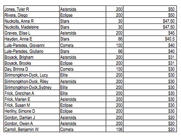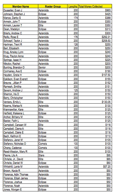 These awards are a surprise and will be handed out at the Awards Ceremony. There will be awards for those swimmers raising more than $100 and up.
