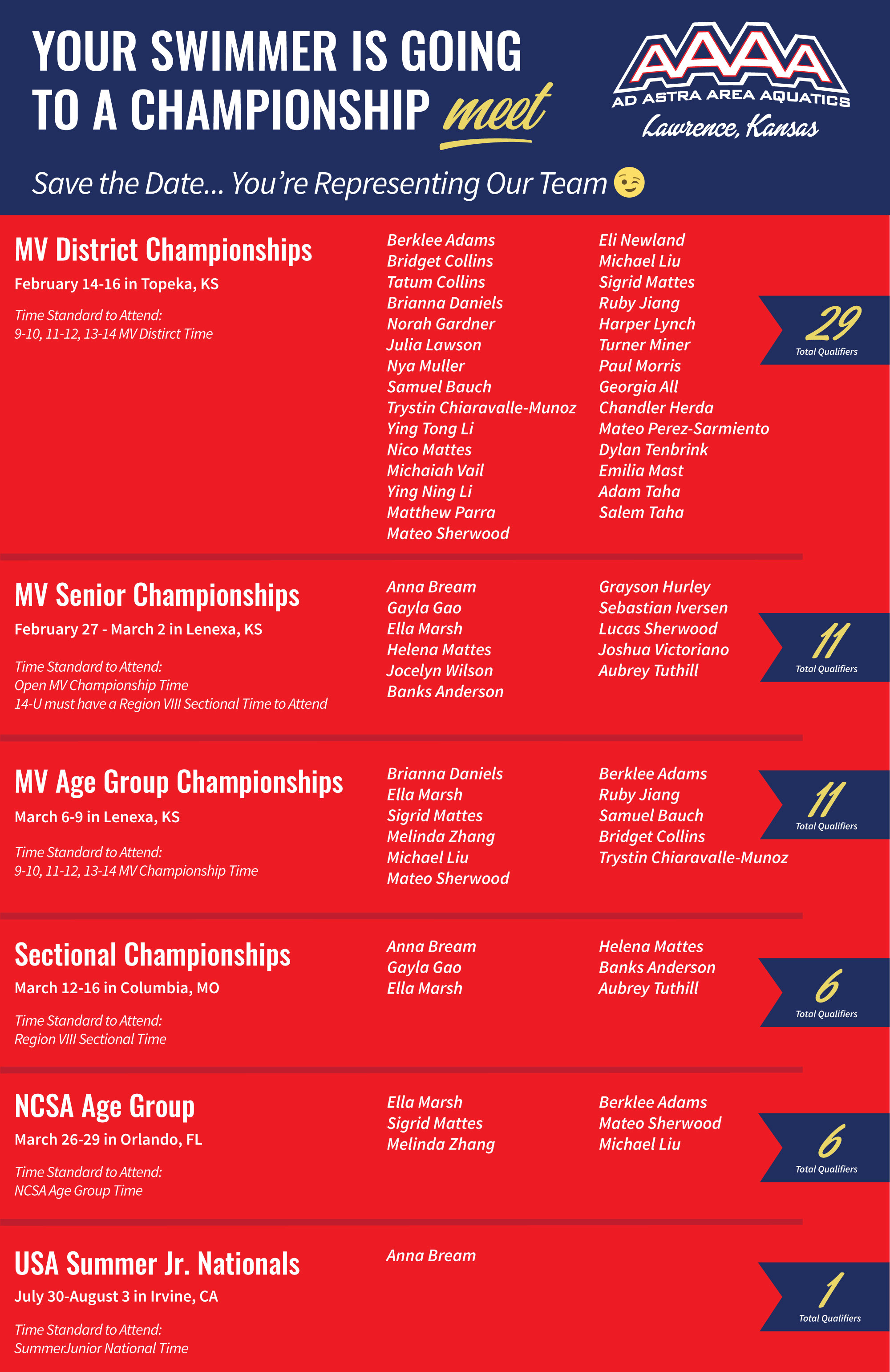 We had 60 AAAA athletes at the meet, including 18 young athletes in the 9-U Championship session. AAAA athletes swam to 45 district cuts and 37 championship cuts. Our District qualifying team now sits at 29 athletes and our Championship team sits at 22 athletes for the Age Group and Senior Champs combined. We have 6 individual NCSA Age Group qualifiers and 6 Sectional qualifiers. We had 20 event winners over the course of the weekend and 31 swims that clocked in at an ‘A’ time or better. We achieved 128 best times as a team. 35 swimmers have now earned their AAAA Towels for swimming in 5+ meet for the SCY season.