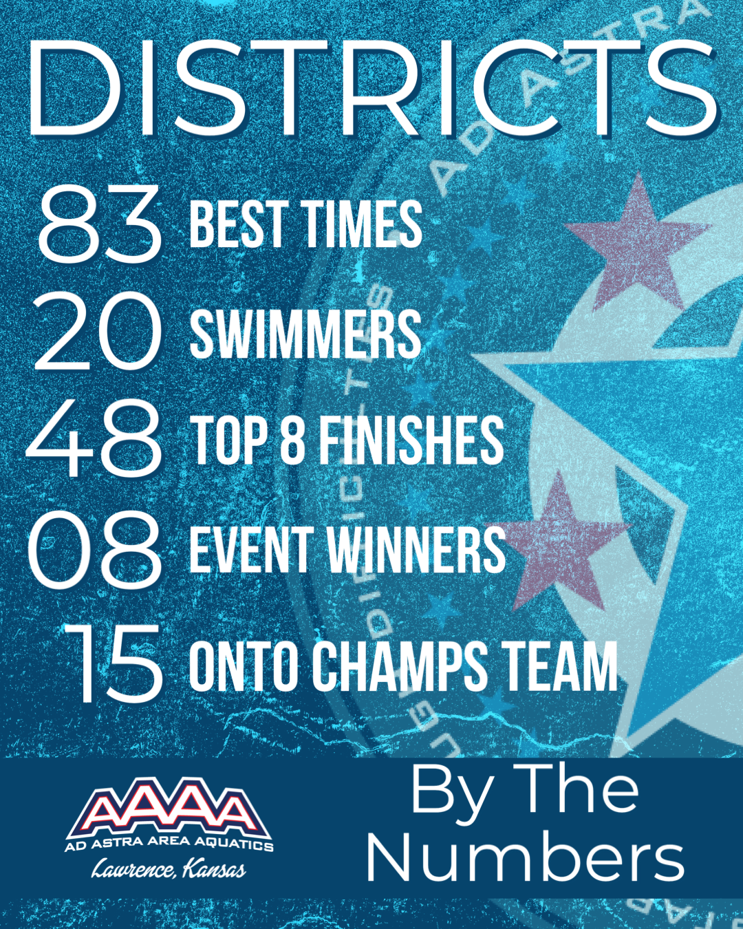 Districts was a blast this past weekend! We are so proud of the 20 swimmers who competed for AAAA. Each athlete’s progress and improvement shined through. Every swimmer went a best time - way to go AAAA!