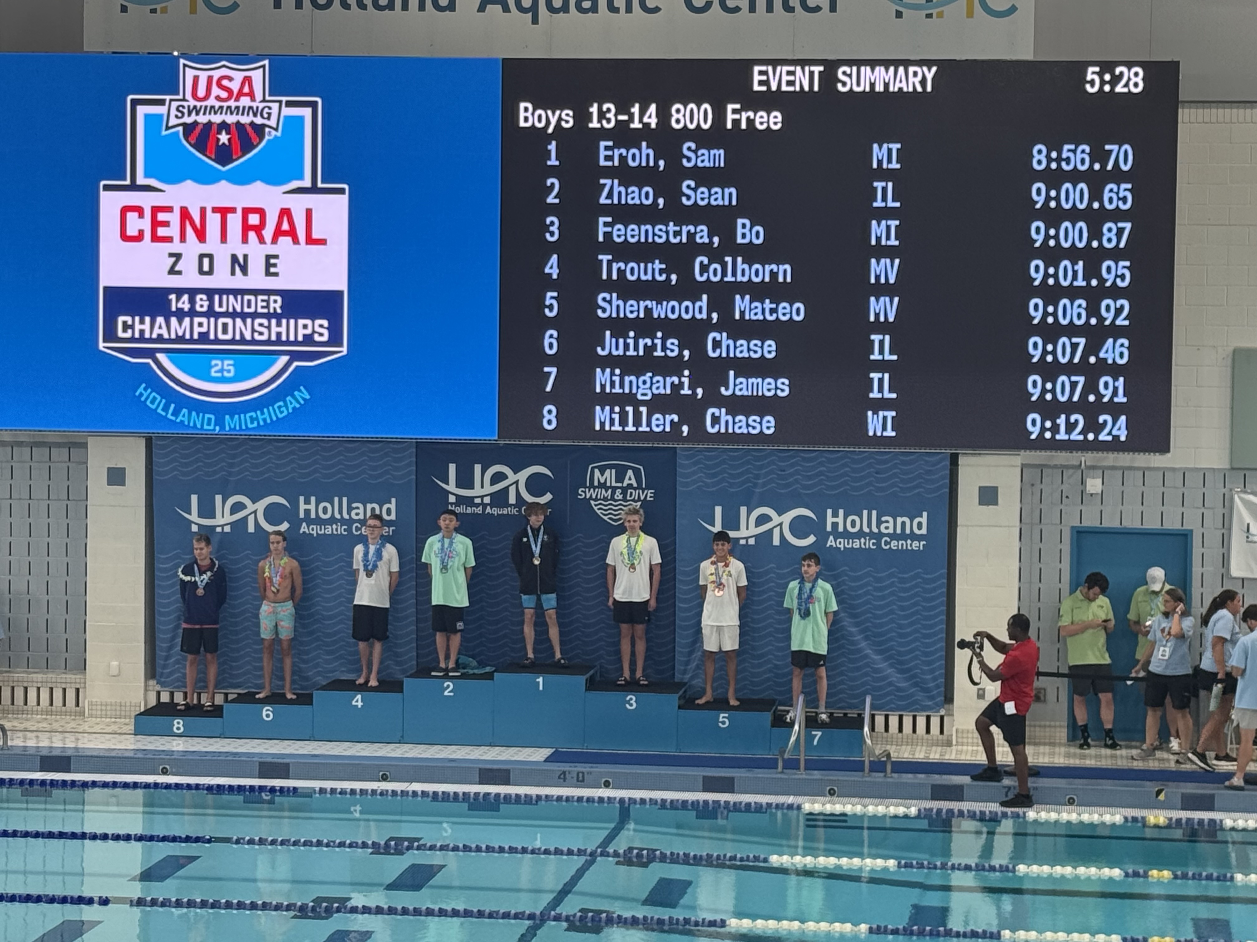 Michael Liu and Mateo Sherwood participated in the Central Zones Swimming Championships this past week in Holland, MI. To attend the Zone Meet, swimmers must achieve a USA Swimming AAA time standard. This is a tremendous achievement for our 14-under swimmers. They represented our team with great swims. Mateo swam to an 18 second drop in the 1500 on the last day and made his first Sectional Cut.