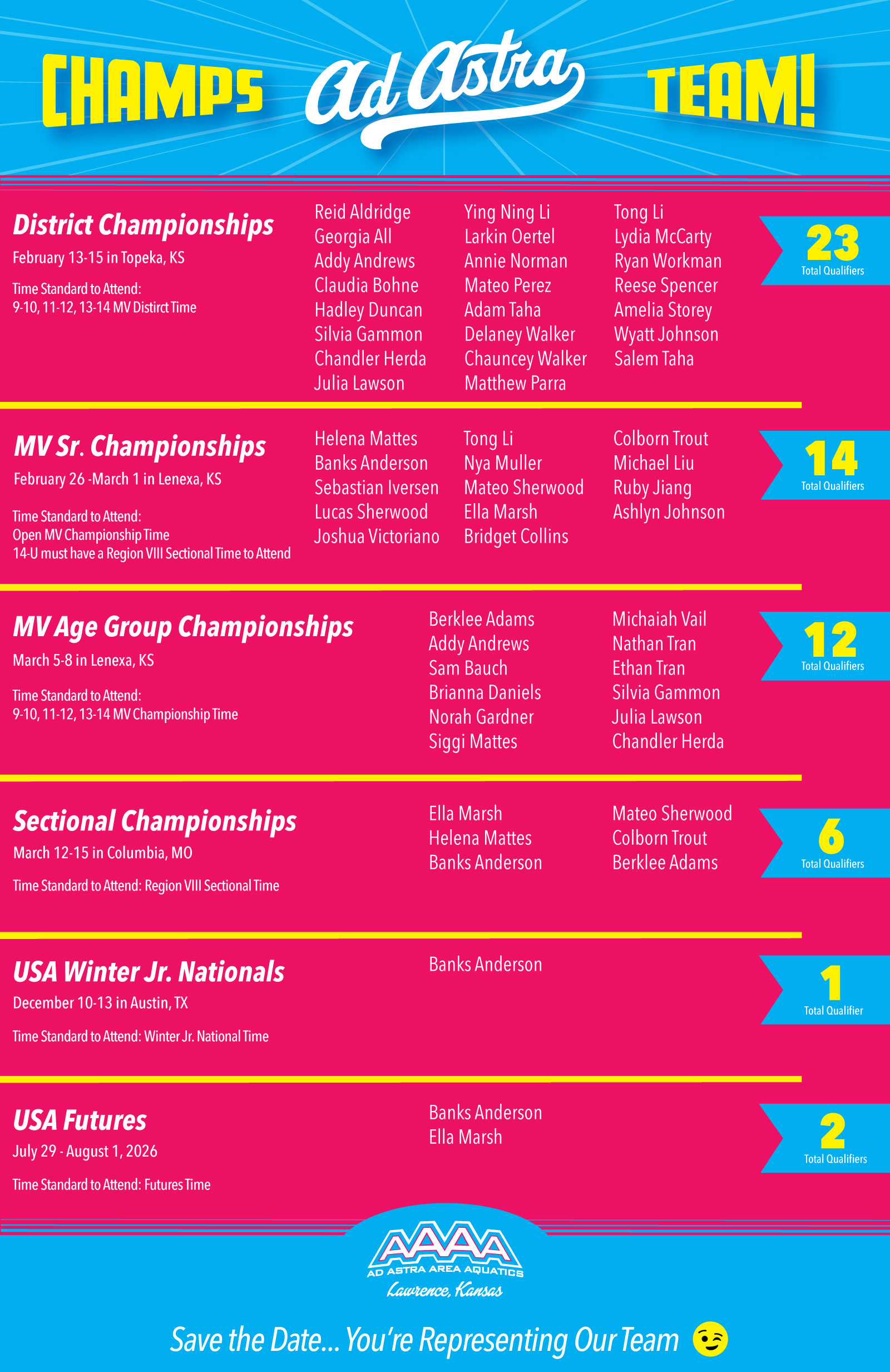 At the Winter Classic, our team took 3rd place overall. The following swimmers placed in the top 8 and/or 16, scoring points for Ad Astra: