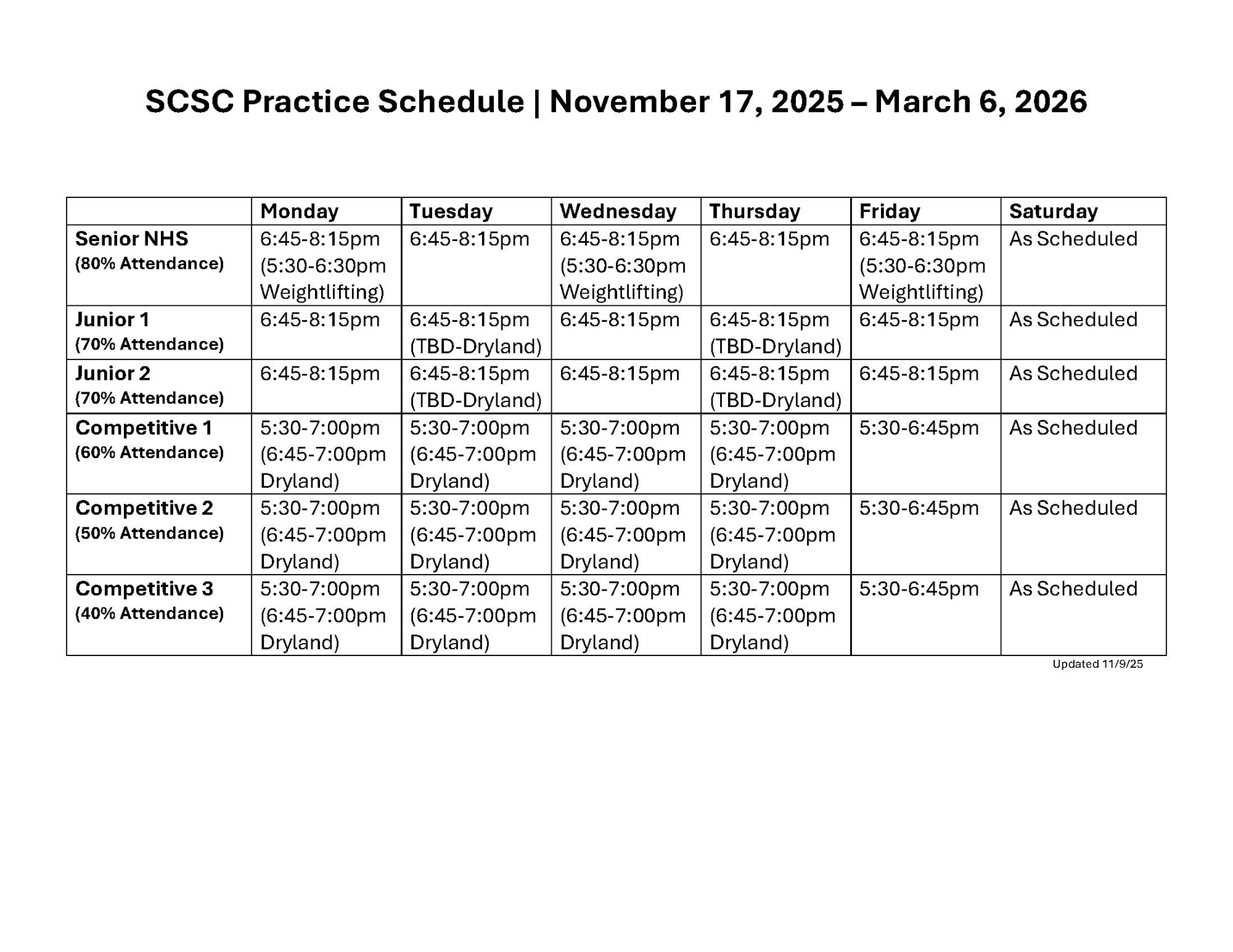 Practice schedule for November 17, 2025 - March 6, 2026.