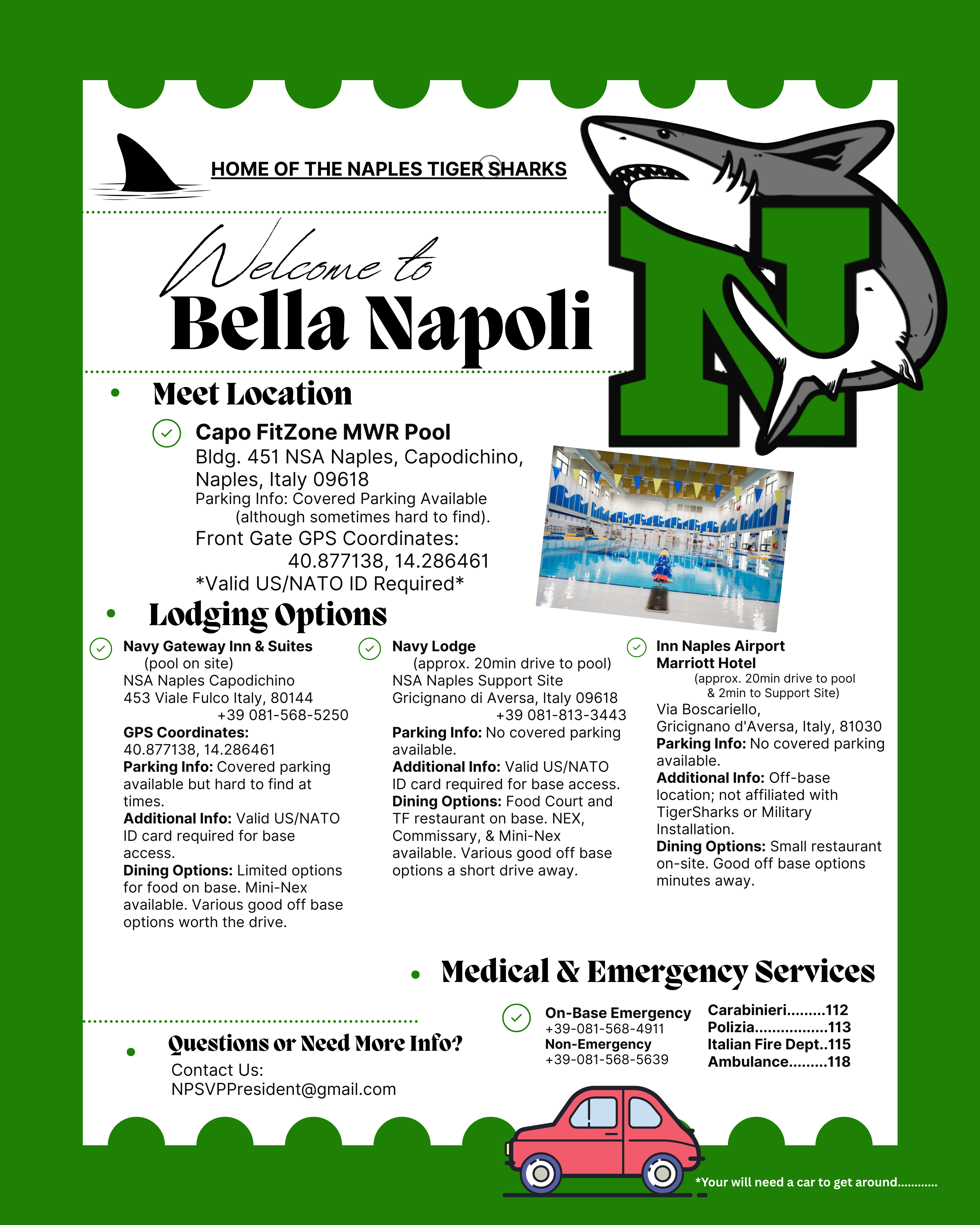 We primarily function our of NSA Naples (Capodichino) MWR FitZone pool, however we also host meets on the economy. Please refer to the meet announcement for which pool to head to.
