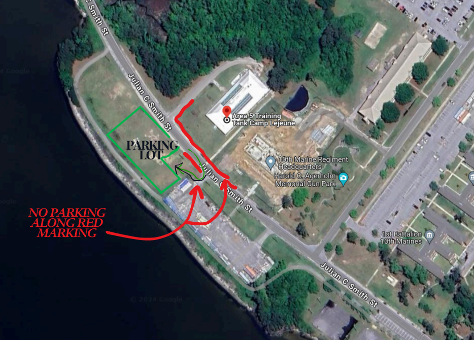 βCCA Camp Lejeune practices at Area 5 Training Tank - Bldg. 540 on Camp Lejeune base, located on Julian C. Smith Street between L and M Street. Please DO NOT park or drop off along the red areas shown below. These areas are to be left open for safety reasons.