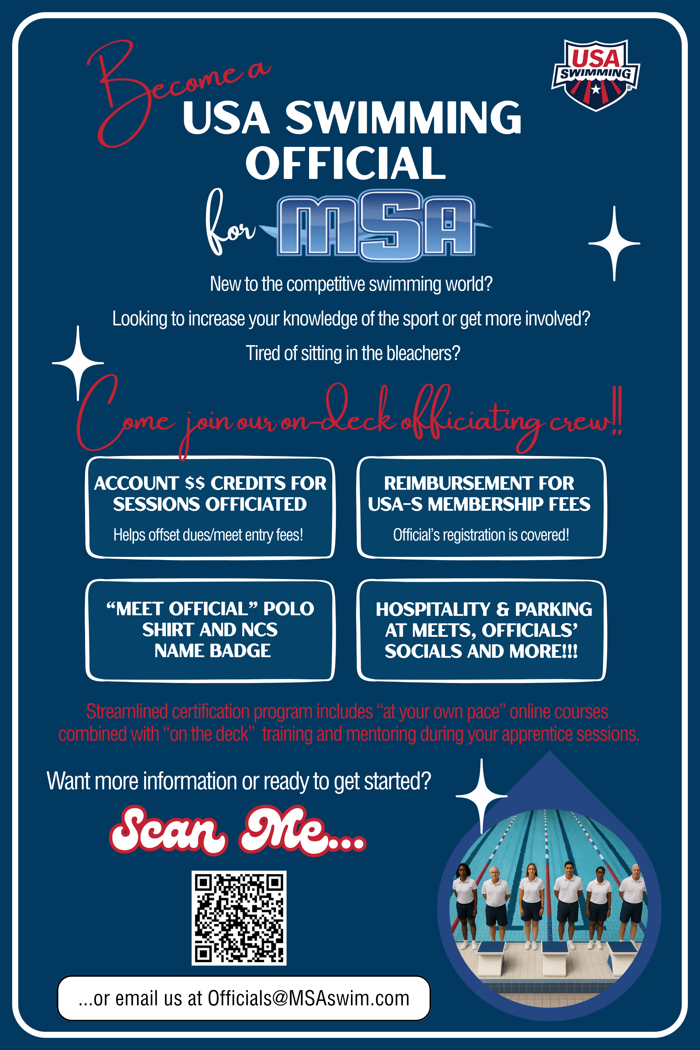 If so, you are invited to join us for an informational social gathering on Tuesday, October 28, 2025, at the Fazen Home in Weddington (off Cox Road). Refreshments will be served, and current USA Swimming Officials will be on hand to answer all your questions about certification requirements and share the advantages of being an official for MSA.