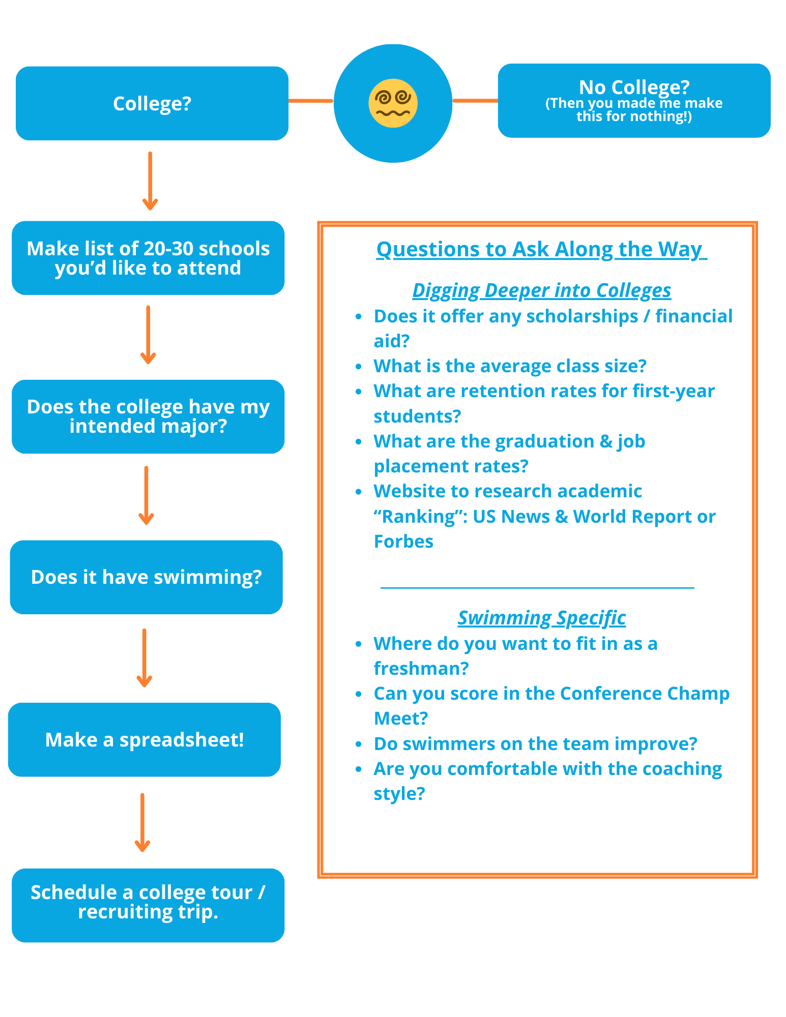 Hi all - attached is a simple flow chart for you and your kiddo to get started when thinking about college. There is also a slideshow with some more in-depth explinations. Take a look and reach out to your child's coach if you want more info.