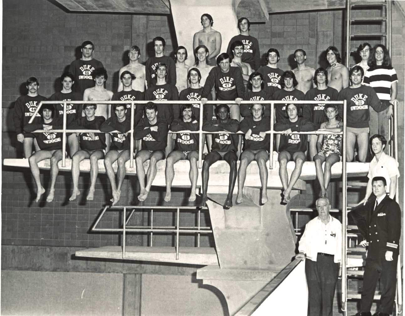 For your enjoyment I also have attached a picture of the 1973-74 Duke Varsity Swim Team. I am kneeling in the second row, far right and Bob Crowder, is the 3rd one in from the right, same row.