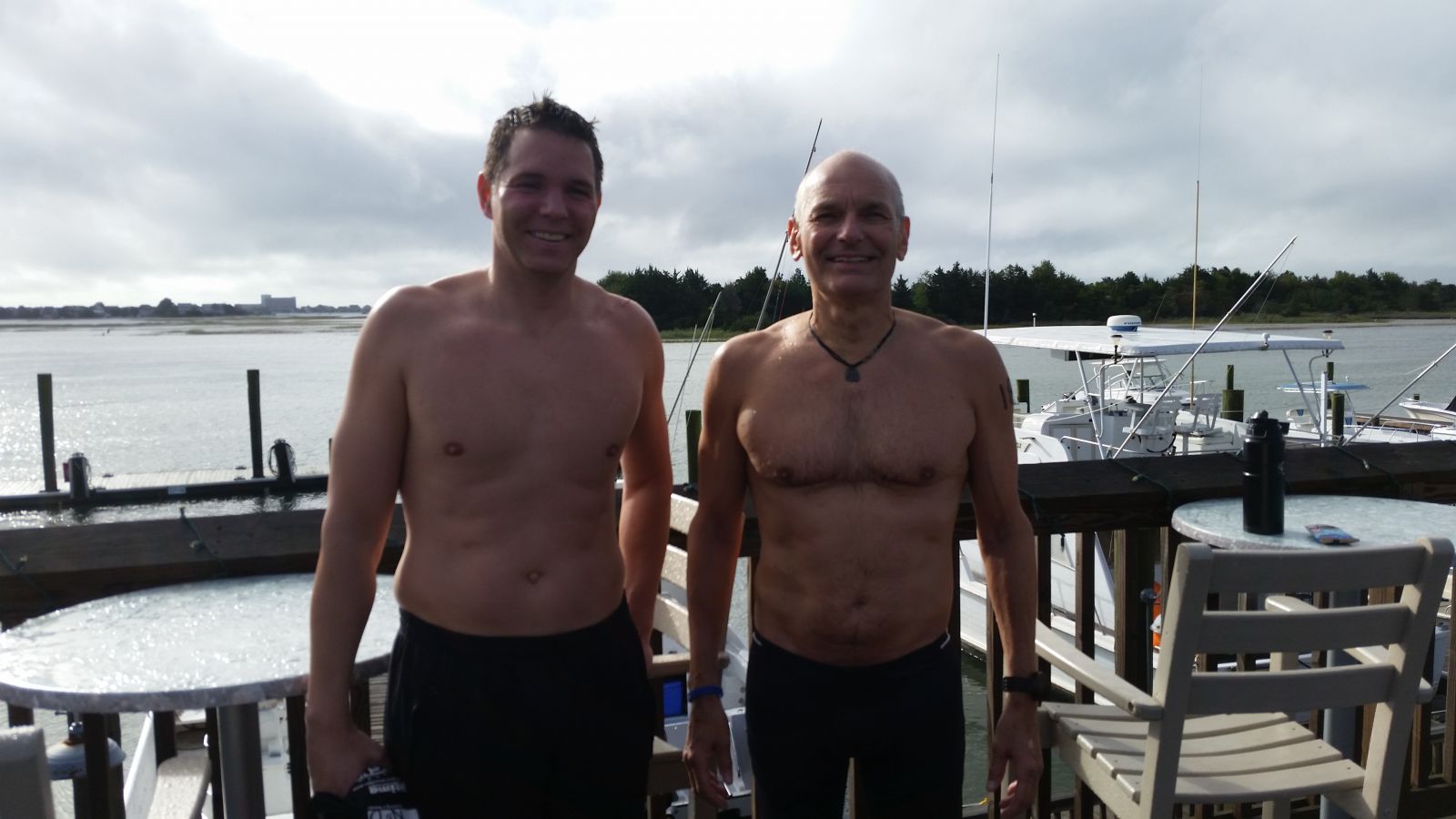The race director had told us to sight on the water tower in the far distance while swimming in Banks Channel which I was able to do. Although I am not sure if the current was pushing me along, it felt like that and I settled into a nice easy pattern of breathing 3 on the left, 3 on the right, 3 on the left and lifting my head to sight. After the 3rd bridge, route 76, I made another sharp right turn into Mott’s Channel only to see a wide vista of marshes and open water ahead and to the left and the island with docks (and barnacles!) on the right. There was a red buoy ahead on the right hugging the shore and a distant yellow buoy straight ahead next to what I later found out was an apartment complex called Seapath Towers with a possible more direct path through what seemed like a marsh or island. I stopped at one of the race boats and asked where I should go and the guide pointed toward the red buoy on the right near the shore. I headed in that direction and down what I thought was the channel only to realize that other swimmers were taking the straight path to the yellow buoy and I was swimming in the wrong direction. Luckily, I had some gas left in the tank and made a beeline, determined to pass the 4 swimmers taking the short cut. I passed them and finished in 1:52:25, 18th among the 52 men and first in my age group; 24th among the 72 men and women. Erik finished 1:32:55 or 4th among the men, 5th overall. The winning time was 1:22:55. All in all, lots of fun and an event I’ll try to do every year.