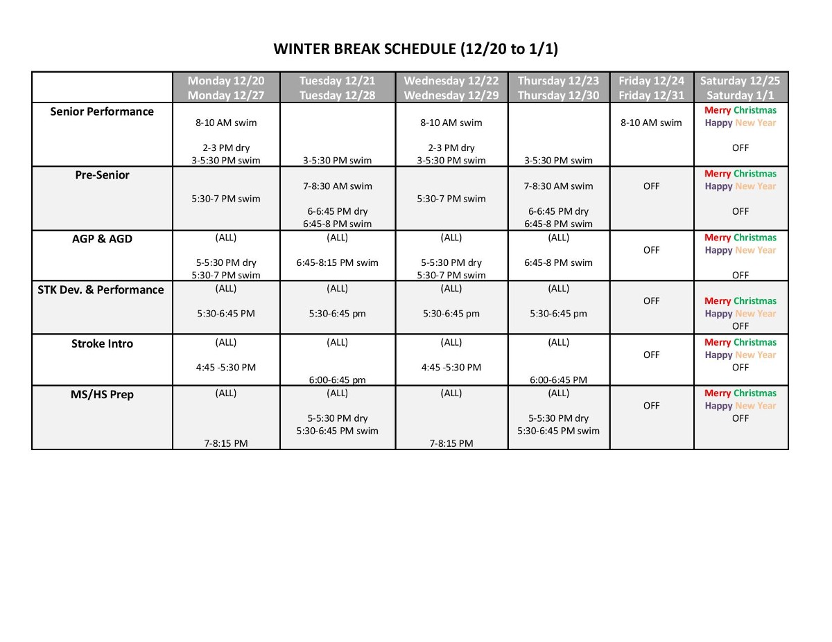 Christmas/New Year's Practice Schedules