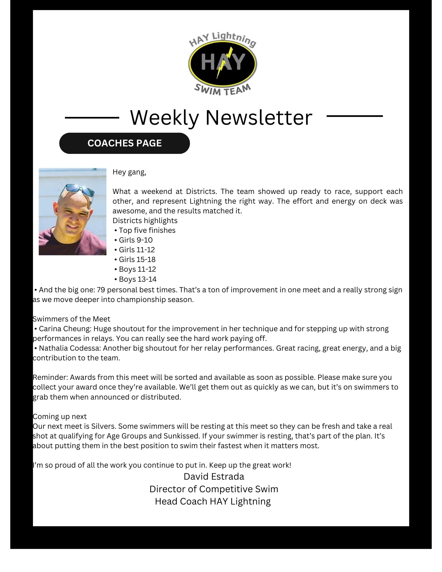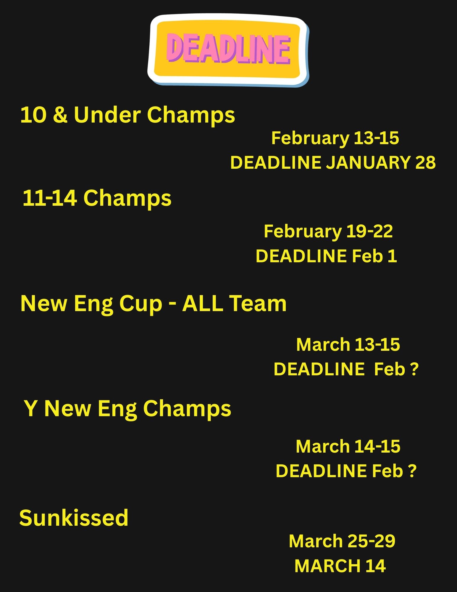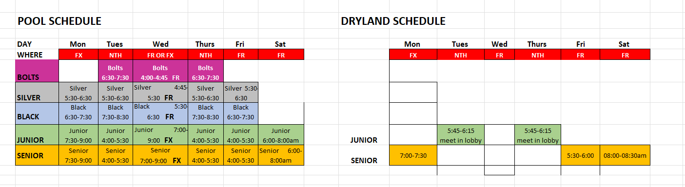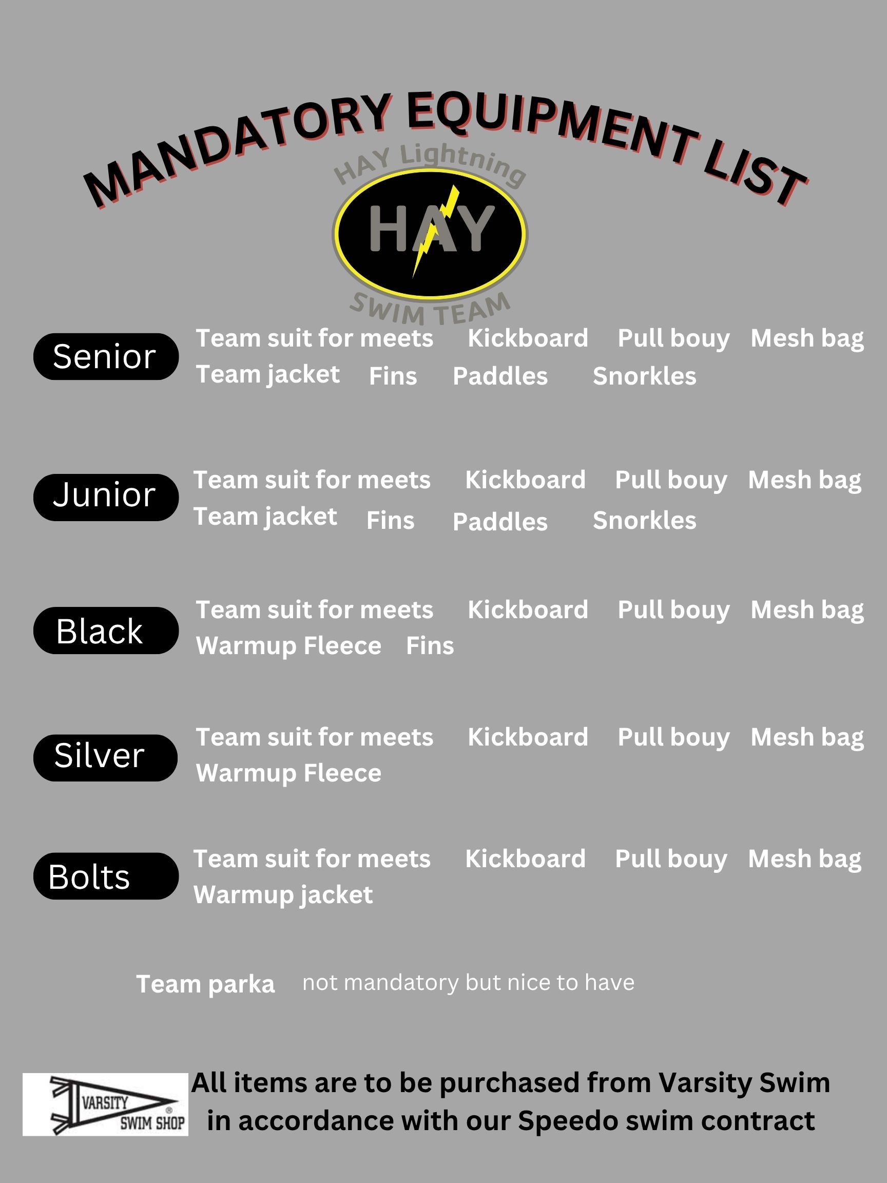 For ALL Meets: Please wear your team shirts in this order: WHITE on Thursday, CHARCOAL on Friday. BLACK on Saturday. SILVER on Sunday.