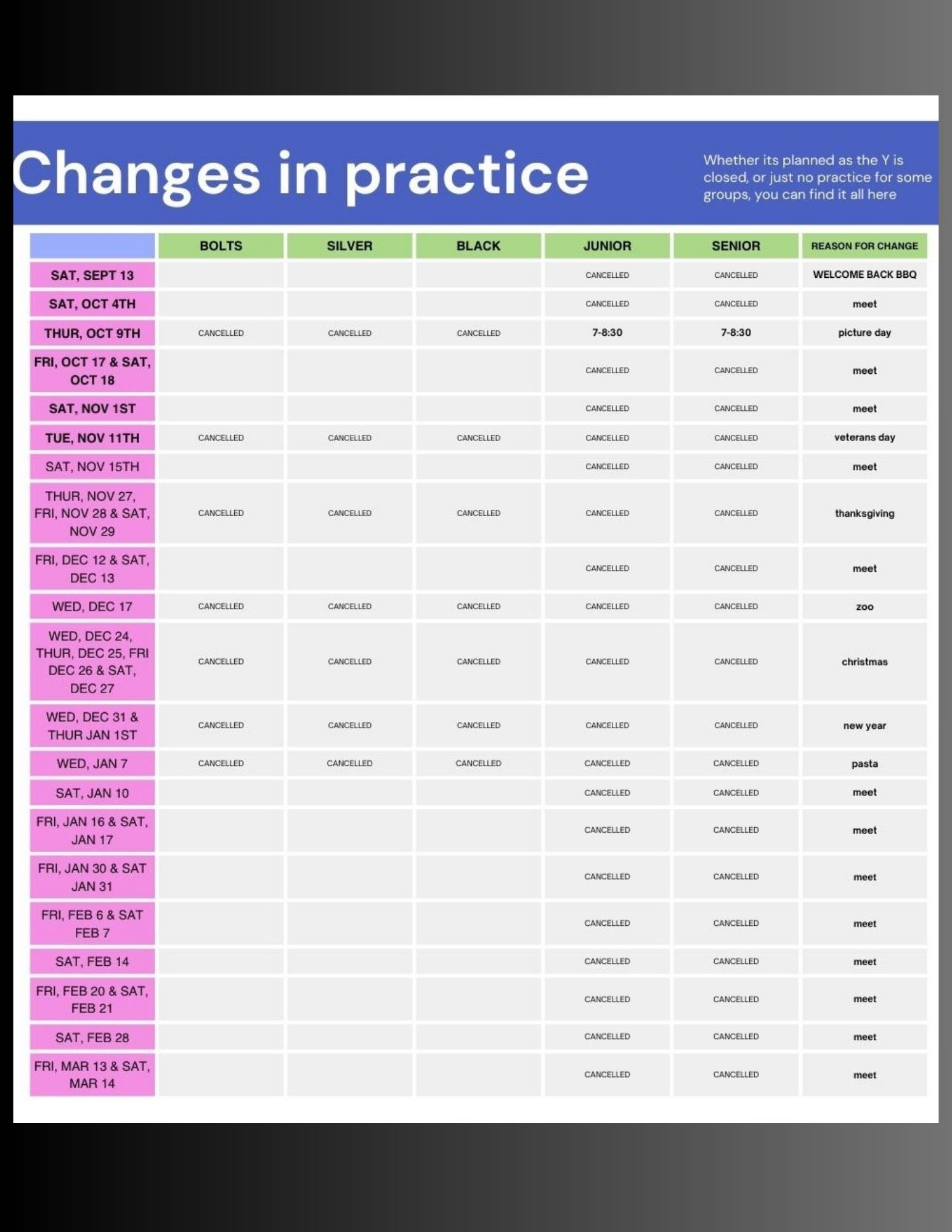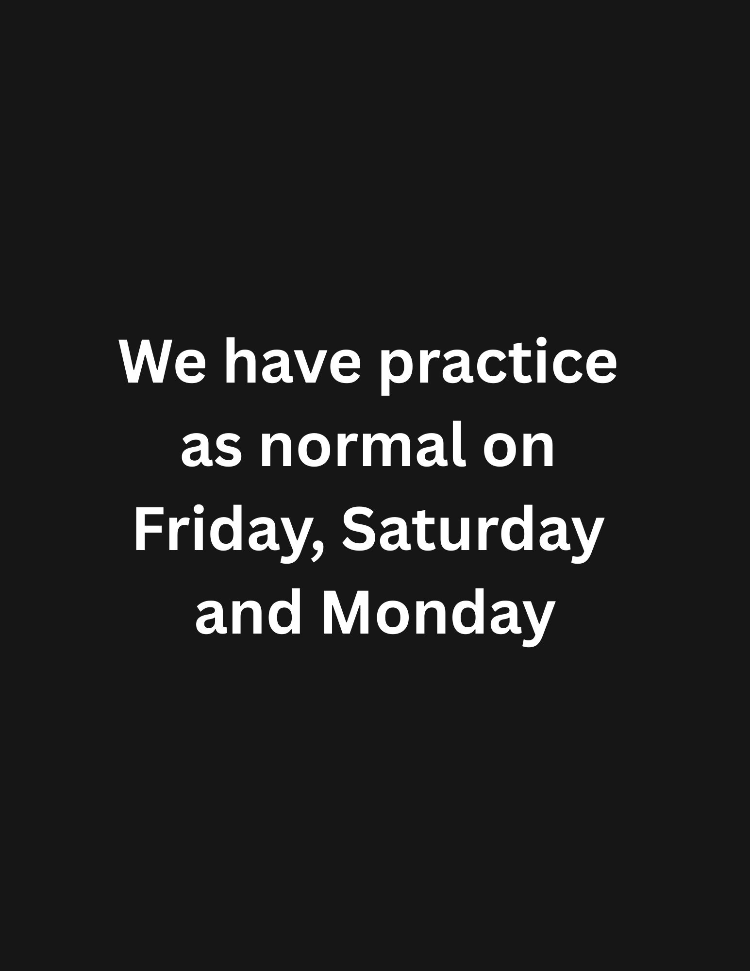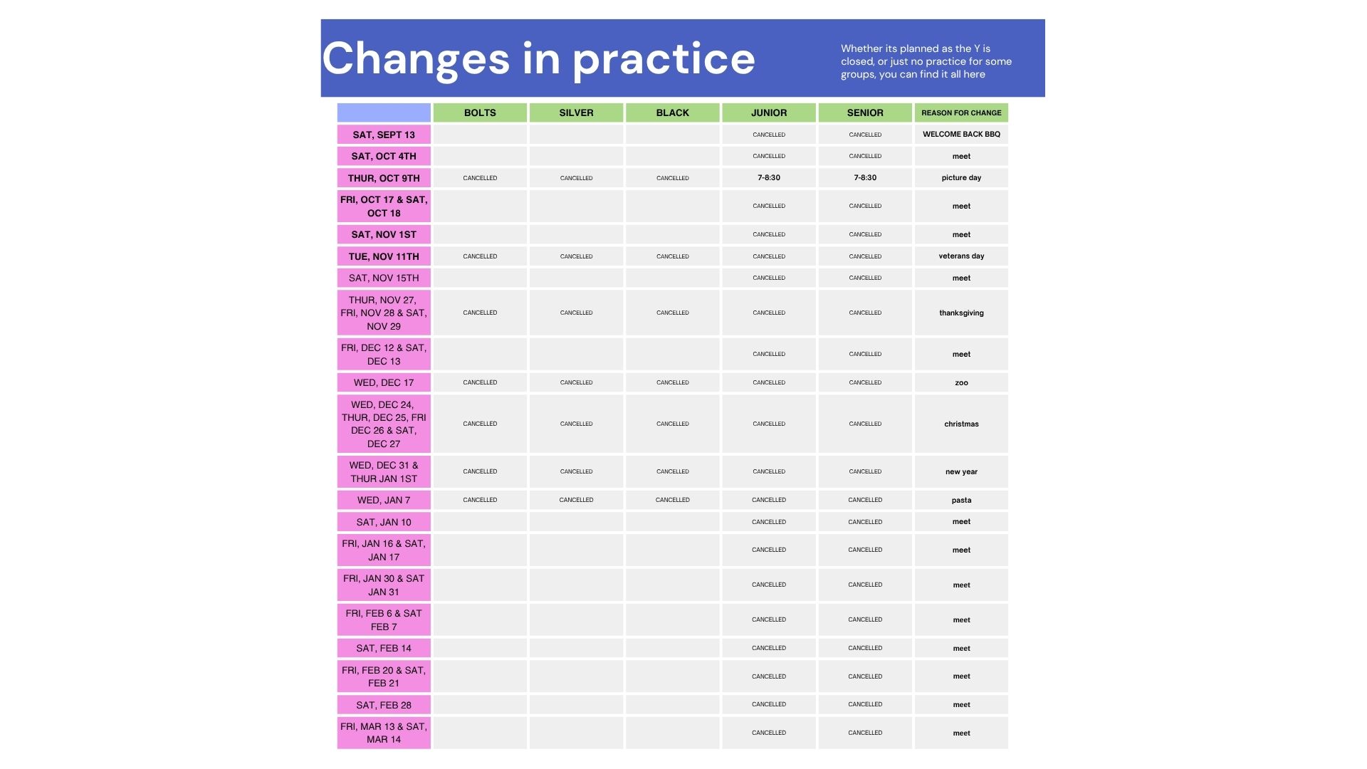 For ALL Meets: Please wear your team shirts in this order: WHITE on Thursday, CHARCOAL on Friday. BLACK on Saturday. SILVER on Sunday.