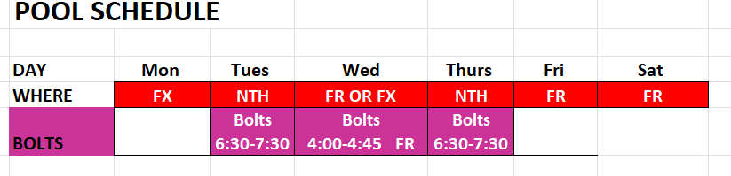 The bolts practice group is our introduction to competitive swimming, with swimmers between the ages of 6 and 11. This will be for our more novice swimmers who require a high degree of stroke development. In this group, we will focus predominantly on strokes and drilling with endurance to be added appropriately. Swimmers in this group are not expected to attend more than two days of their practice, although they are welcome to and will see greater development if they can attend more. They are USA Registered as Flex Athletes, as they are expected to attend two USA Meets each season, they will also be expected to attend any YMCA Intramural Meets as instructed by their coaches. This group is required to have their own team suit, goggles, water bottles, kickboards, pull bouys, mesh bag and warmup jacket.