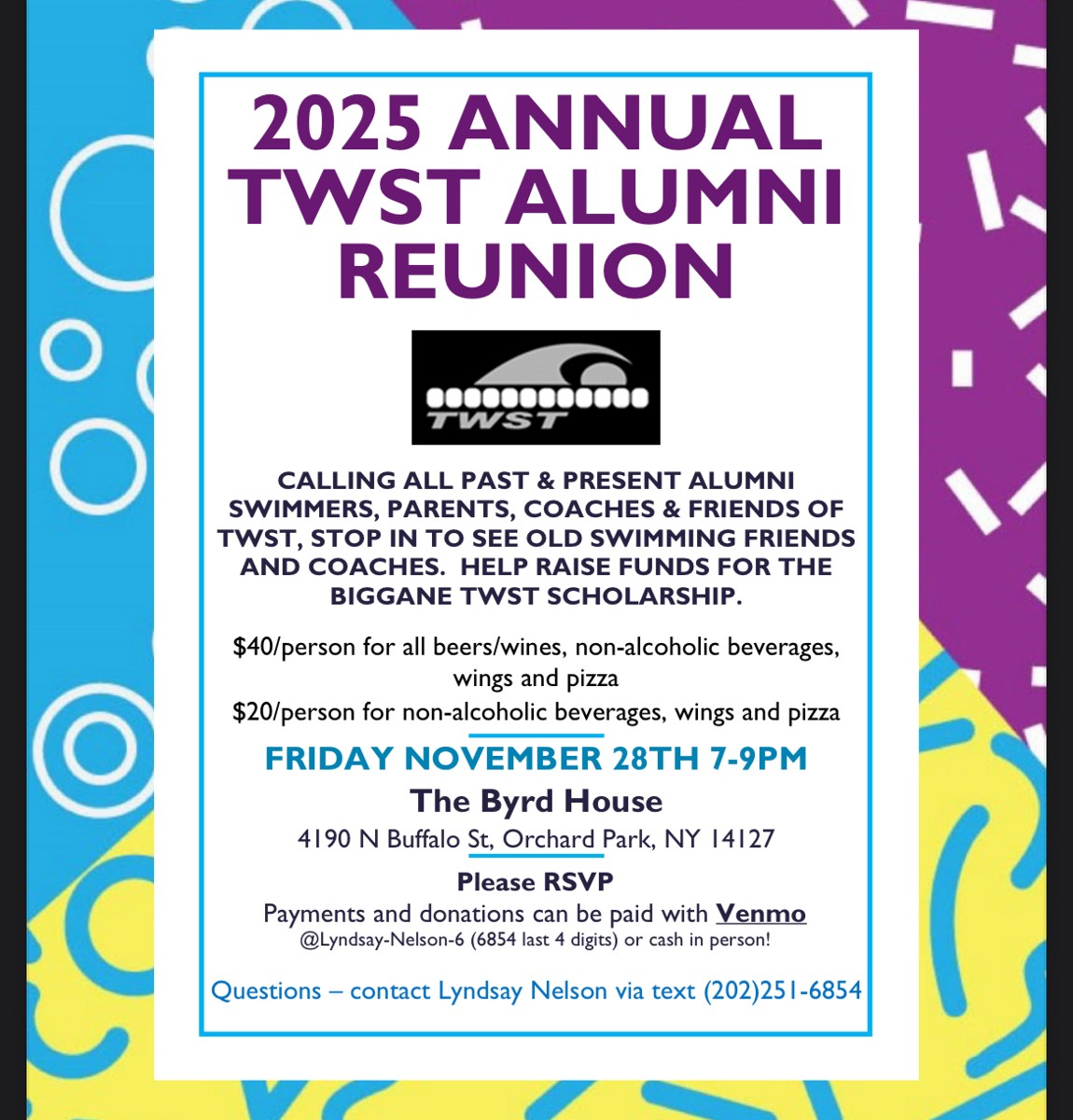 Our Turkey Splash Team Challenge Meet is just around the corner. Register your athlete to swim by today and our Job Sign Ups will be posted soon. An email will go out when the Job Sign Ups are open. Please check out the attached flyer for our Alumni Event that raises funds for our Jeanne Biggane Scholarship each year. All are welcome to attend.