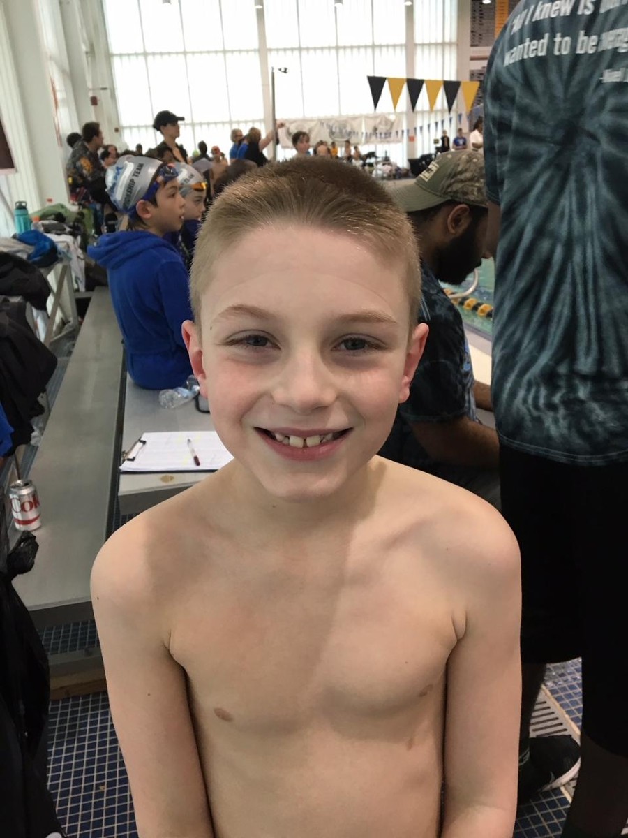 Ty Hollar, our youngest team member, showed off his progress this season by not only qualifying for this meet, but coming home with about 13 seconds of improved time over his 3 swims: 100 Free (-4.83), 100 IM (-2.29), 50 Back (-5.84).