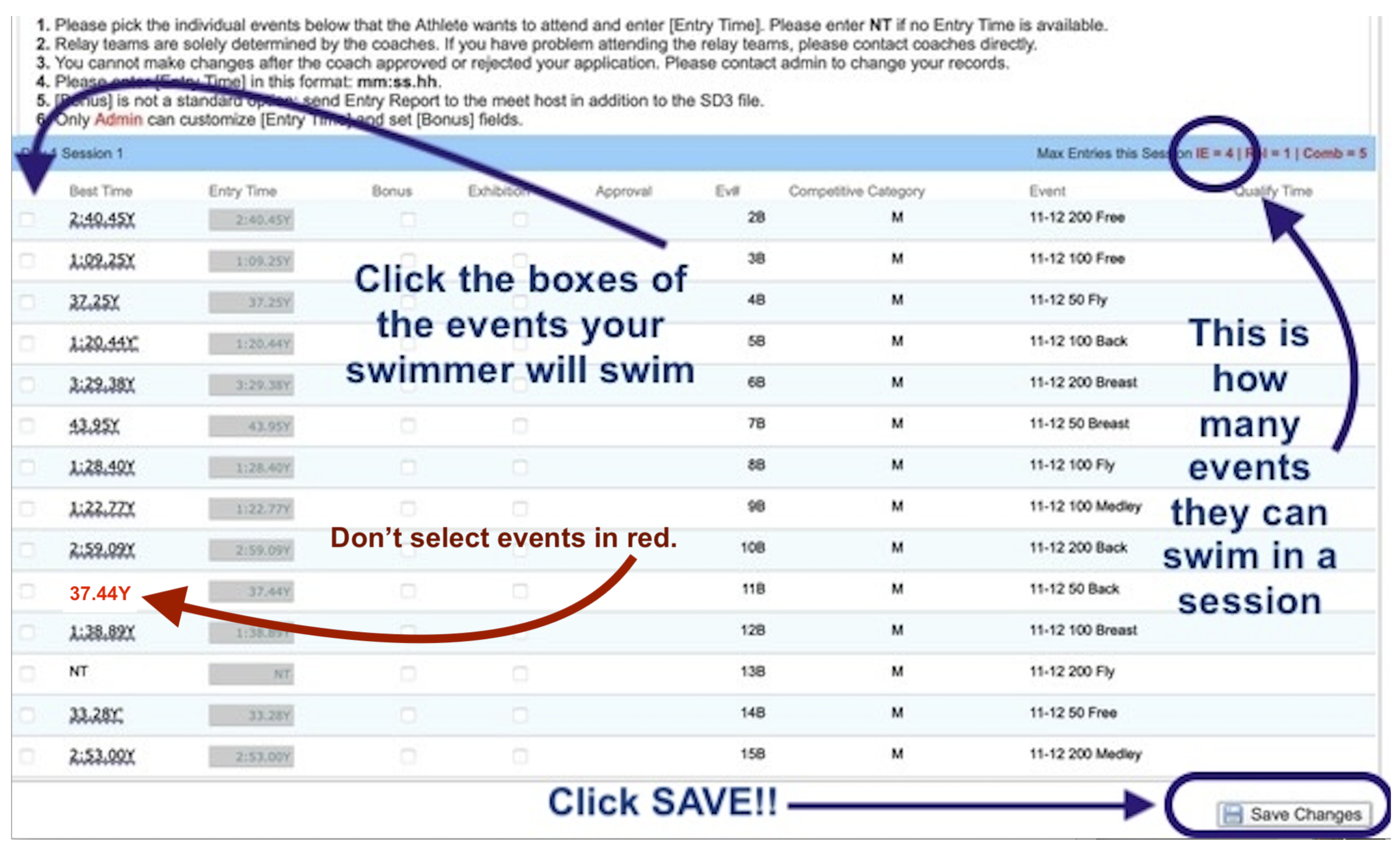 Scroll through the Meet Events to the meet you'd like to choose the events for > click Edit Commitment at the top> click your swimmer's name > you can select from the events that are written in black, not red. Check the boxes next to the events you want to pick. If you do not want to swim the maximum number of events or if the swimmer is only attending one day of the meet, indicate special instructions in the Notes box at the top. When finished, click SAVE CHANGES at the bottom.