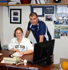 Westfield Area Y Devilfish Swim Team standout Abby Pires of Mountainside signs a letter of commitment to attend Lehigh University, Bethlehem, PA. Pires has been a member of the Devilfish for 8 years and is a 5 time qualifier for YMCA Nationals in 100 and 200 Breastroke, and the 200 and 400 Medley Relay. Pictured with Pires is Brian Guidera, Westfield Area Y Devilfish Head Coach and Director of Competitive Aquatics.