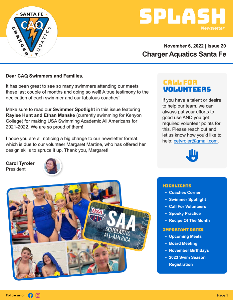 Hello Charger Families! Check out our November issue of CAQ SF Splash to learn important news about our club: - President's Message - Updated Practice Schedule - Annual Registration Requirements and Instructions - Coaches Corner: High School Season - USA Swimming 2025 Club Excellence Recognition - Swimmer Spotlight - October and November Birthdays - Team Gear - Helpful Apps