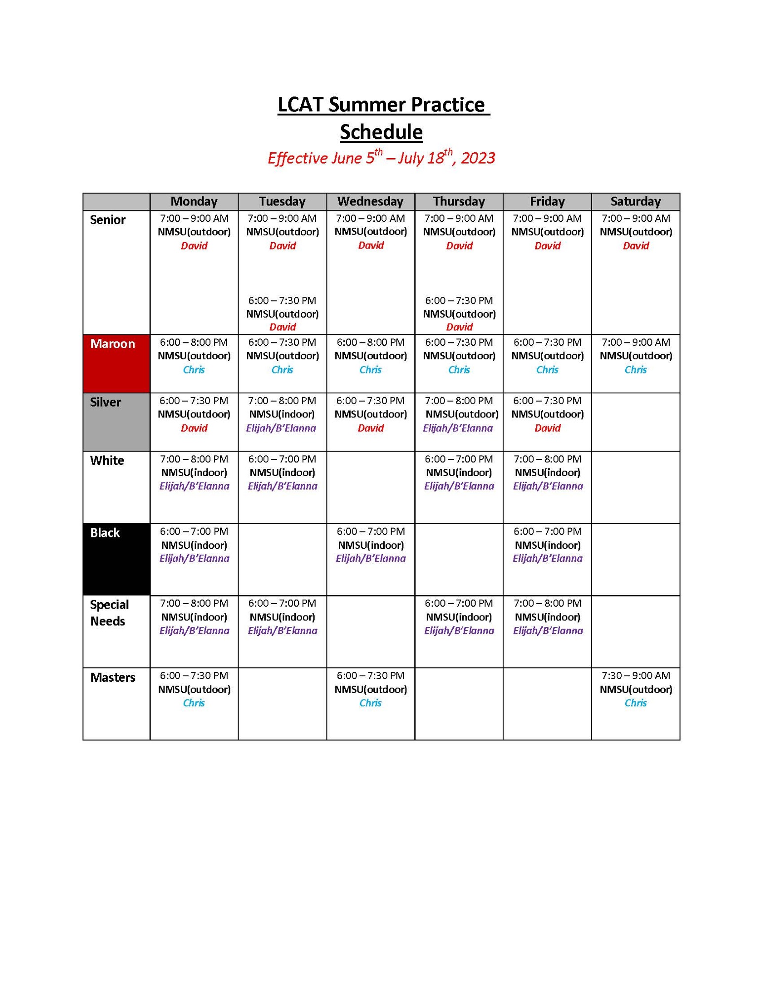 Attached is the summer practice schedule. Effective June 5th. Please look at it carefully! Key points.....