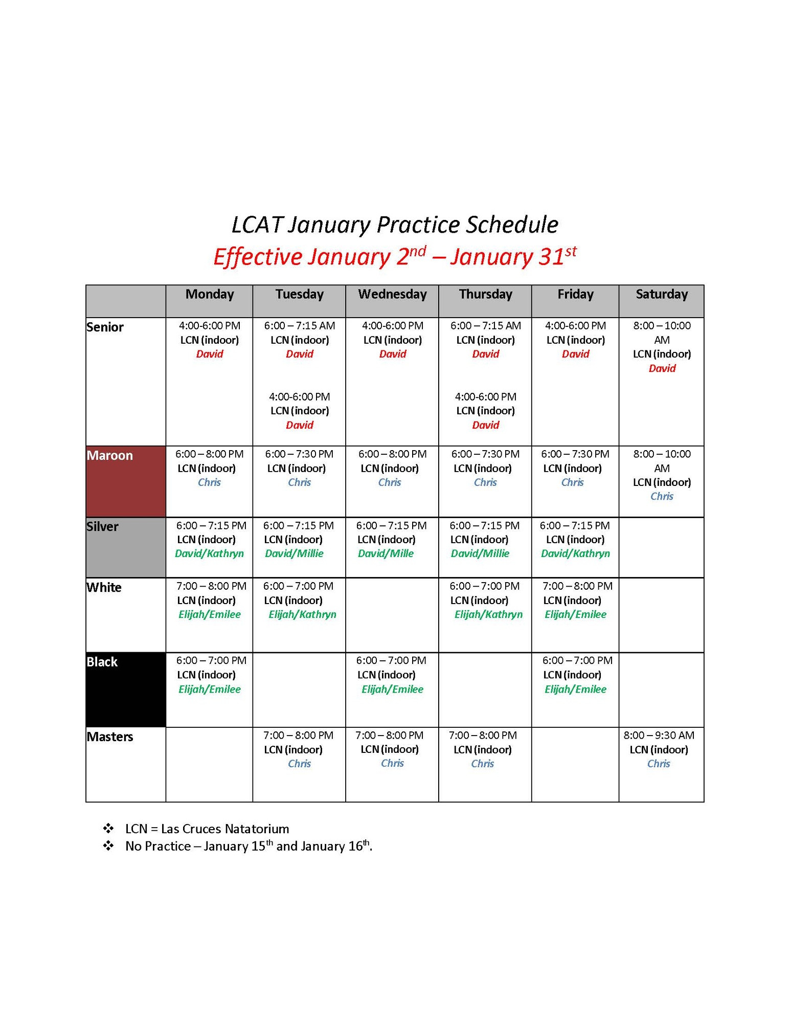 Reminder that there is no practice January 15th and 16th. Additionally we will remain on the current practice schedule at the City Pool through January 31st.