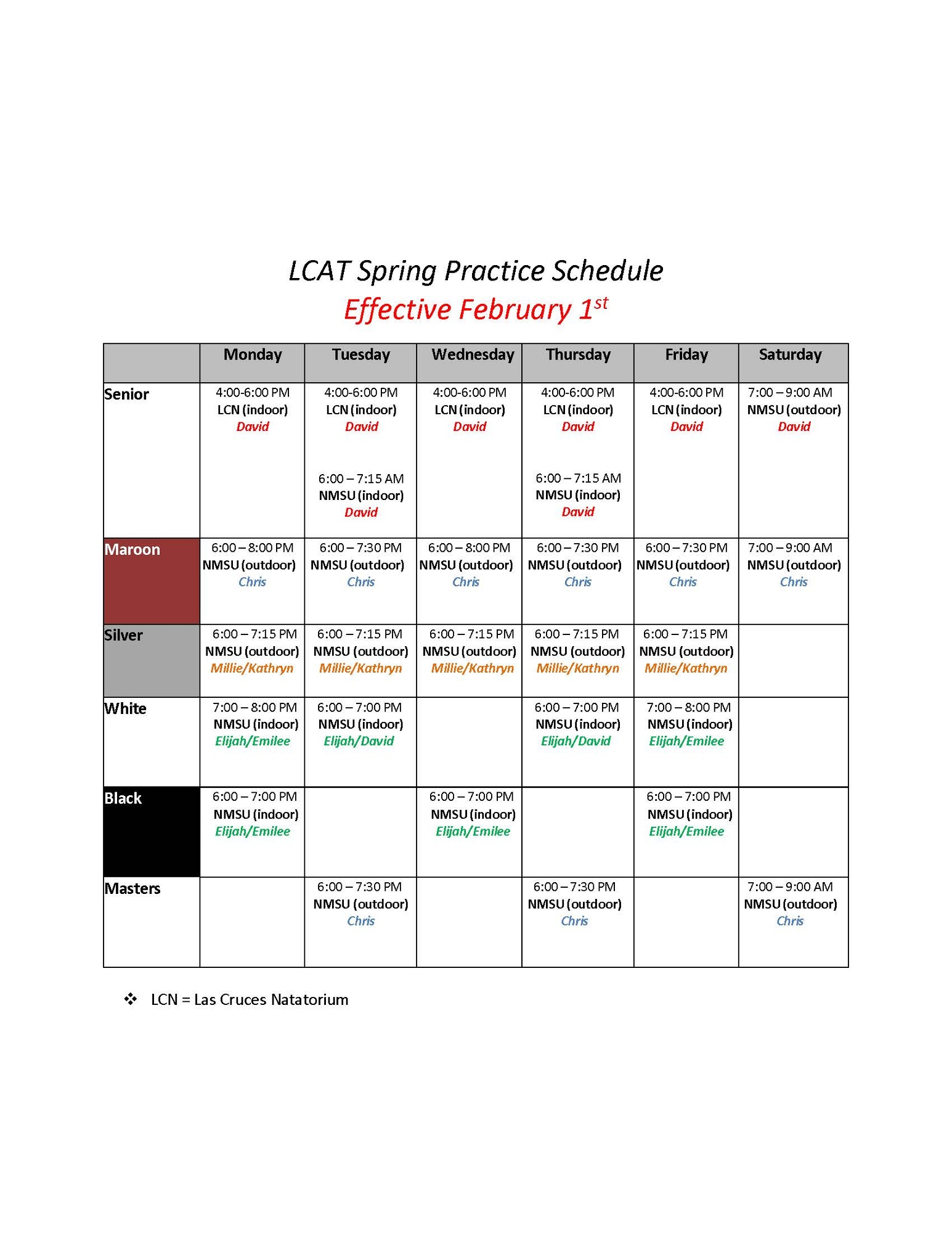 Attached is the Spring Practice Schedule effect February 1st. Please read carefully and reach out with questions.