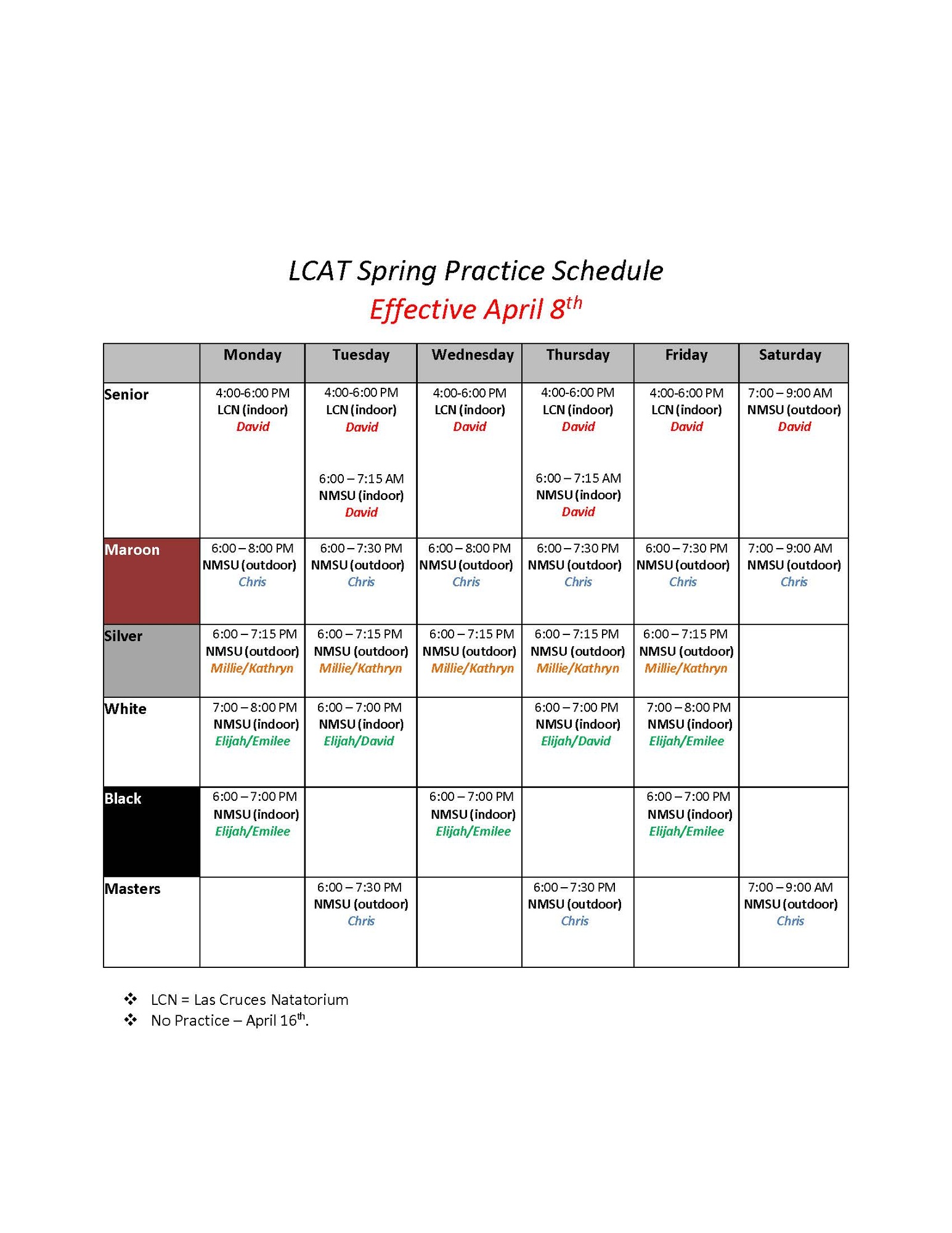 I hope everyone has enjoyed some deserved time off! Attached is the practice schedule for when we return on April 8th. Notice a majority of our groups will be returning to NMSU. We will switch to a summer practice schedule (coming soon!!) on June 3rd when school gets out.