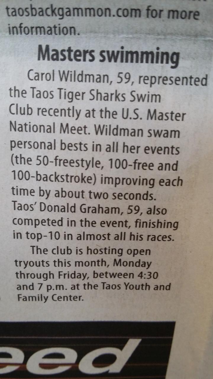 Congratulation to Carol Wildman and Donald Graham! Excellent performance at the U.S. Master National Swim Meet in Santa Clara California on May 2nd - 4th, 2014