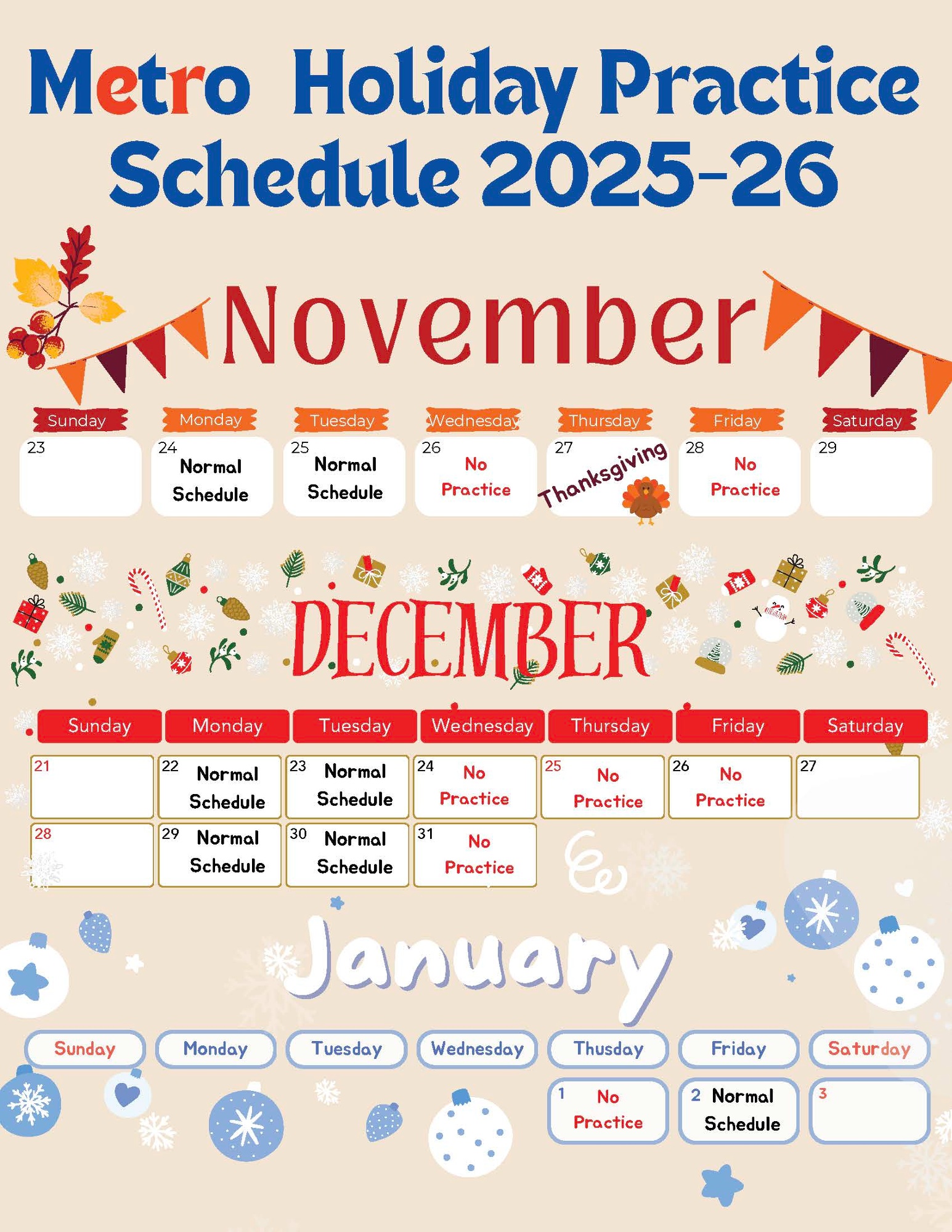 Throughout Thanksgiving, Christmas, and the New Year we well be continuing practices at their regular scheduled times, or it will be a day off. There will be NO adjusted times to Metro practices.