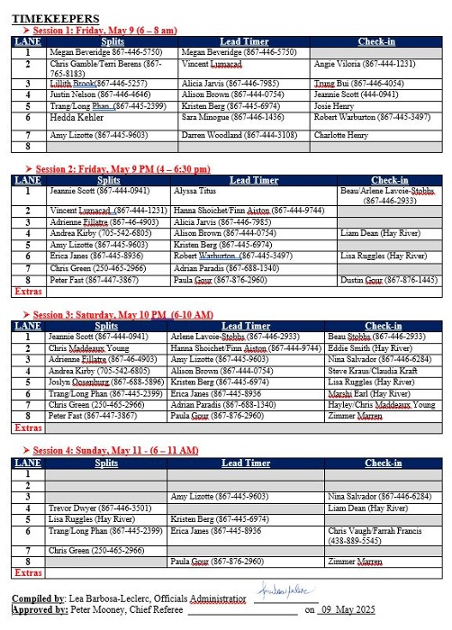 Attached is the most recent list of timekeepers for this weekend. If you can find a little time to help out on Friday morning (need 1 timer) , Friday evening (we need an additional 4 timers) and on Sunday morning (we need an additional 12 timers), please reach out to Lea at 867-444-9660 and I will add your name.