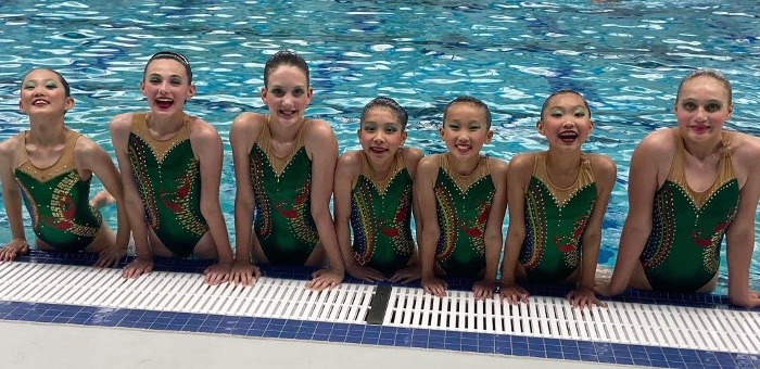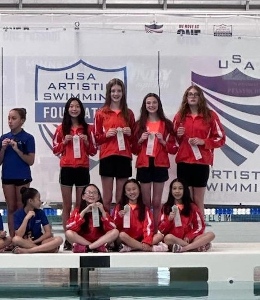 This meet was a bittersweet one as it was the last competition for seniors Carly Ermer and Angelie Roger. Angelie will be moving on and swimming Division I with the Buckeyes of The Ohio State University. Carly will also be swimming Division I with the Cardinals of the University of the Incarnate Word in Texas. Qualifying routines for JOs were two soloists, one duet, team and the acro routine. There were lots of nailbiting moments with many high performing teams pushing the levels of difficulty. Competition was fierce and placements often moved between the Prelim and Finals. The girls swam their hearts out and in the end EVERYONE brought home a medal(s).