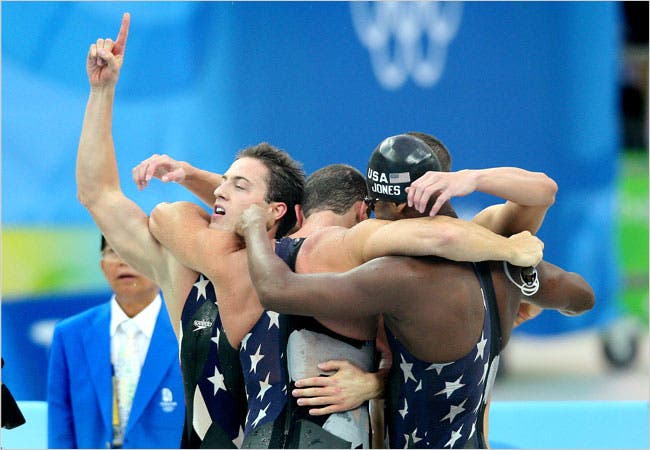 The USA sensationally break the world record for the men's 4X100M freestyle relay at the Beijing 2008 Summer Olympic Games.This is considered the best swimming race of all time with Jason Lezak coming from behind to help keep Michael Phelp’s dream of 8 Olympic Gold medals alive