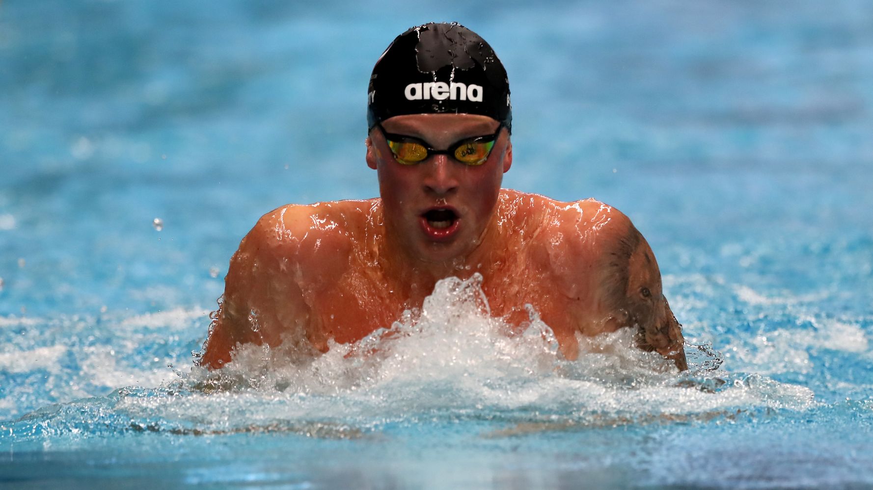 Great Britain swimmer Adam Peaty wins gold with a new world record in the 100m breaststroke at the Rio 2016 Olympic Games. He won the gold medal in the 100 metre breaststroke at the 2016 Olympics, the first by a male British swimmer in 24 years. He is the current holder of the world record in 50 metre and 100 metre breaststroke events.