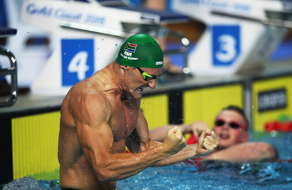 South Africa's Cameron Van Der Burgh sets a new world record of 58.46 as he wins the gold medal in the men's 100m breaststroke event at the London 2012 Olympic Games and dedicates the swim to the favourite before the games who tragically died of a heart attack, Alexander Dale Oen.
