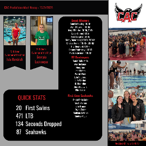 Seahawk Families, Over the weekend we had 87 Seahawks compete in the CAC Pentathlon. Thank you to all of our parent volunteers who helped make the meet run smoothly, all of our officials, as well as everyone who donated to concessions and hospitality. We wouldn't be able to give the swimmers an opportunity to race without your help. Overall this meet was a great opportunity to see where we’re at with only a few weeks of training, and to try some new events. As a team we deleted 24 NT...