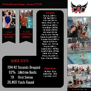 I hope everyone is having a great Holiday season so far! Over the weekend 27 Seahawks attended the Ohio virtual distance challenge we hosted at Cincinnati Country Day Highschool. Over the course of Saturday we dropped around 204 seconds, even though out of our 27 swims 19 of them were first times. So our 8 Seahawks who had times dropped an average of 25 and a half seconds! Big shoutout to all of our competitors for either trying something new, or crushing their best times! Thank you to all of...