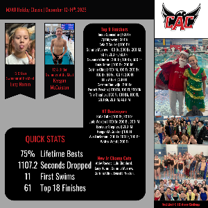 Over the weekend 49 Seahawks braved the cold temperatures and icy roads to race in Oxford Ohio at the MAKOs Holiday Classic. We dropped over 1100 seconds over 288 swims, with 11 of those swims being the first time the swimmer had attempted that event! On Saturday we earned 28 finals swims before the finals session on Sunday needed to be cancelled due to weather. Thank you to our parent timers for volunteering to be on deck for the entire session, including some of the 1000s. Also Coach Matt would...