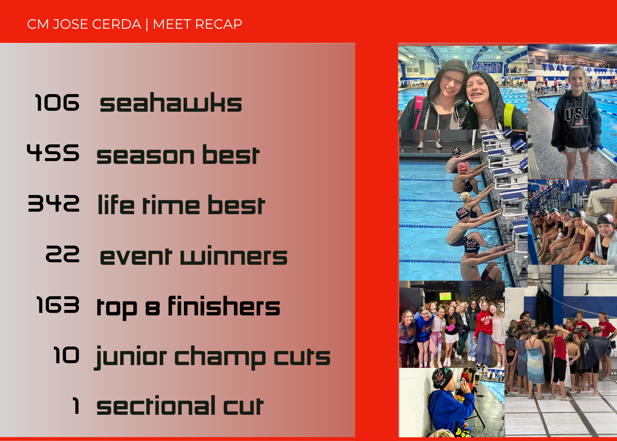 We had 106 swimmers compete in the Jose Cerda Memorial Invite. Overall we were very happy to see the swimmers apply the things they have been learning at practice into some amazing swims. There is nothing better than having a great swim with plenty of room to improve, and we are so excited to keep working and see where our swimmers will be by the end of the season!