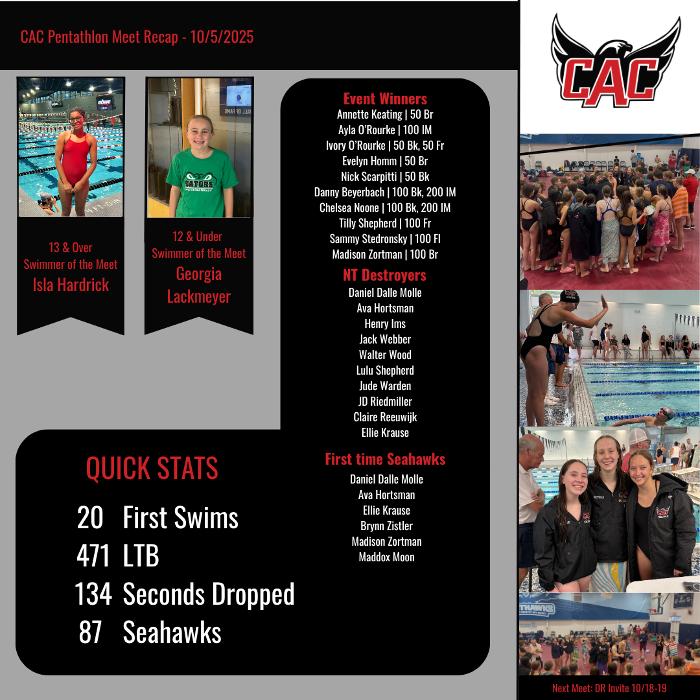 Over the weekend we had 87 Seahawks compete in the CAC Pentathlon. Thank you to all of our parent volunteers who helped make the meet run smoothly, all of our officials, as well as everyone who donated to concessions and hospitality. We wouldn't be able to give the swimmers an opportunity to race without your help.