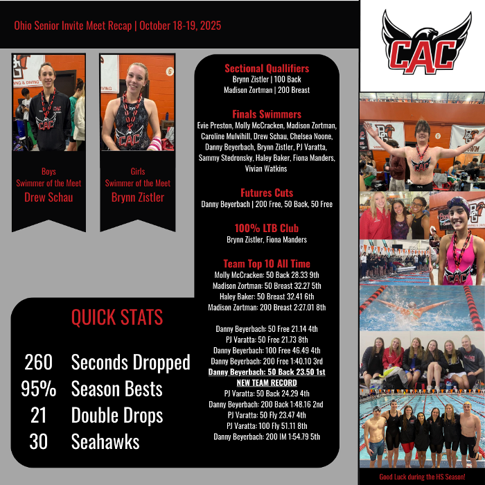 Over the weekend 30 Seahawks made the trip to Bowling Green for the Ohio Senior Swimming Invite to compete amongst 670 highschoolers. Thank you parents for everything you did to make the weekend great for our swimmers! Our swimmers had 95% season best times, meaning almost every single swim was the best so far this season! Overall the coaching staff also saw a lot of improvement in terms of owning their performances and staying positive regardless of the result.