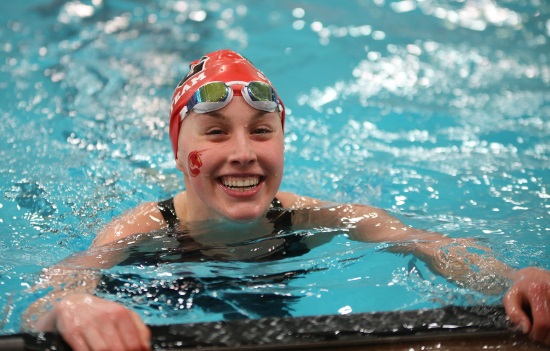 One of the most exciting swims of the evening came from McKayla in the 100 free. She had a big time drop (50.74) and achieved a very rare freshman win at the state championships. McKayla’s CSG teammates kept the momentum going in the 200 free relay, as they won in 1:35.70 with a huge anchor leg from Miranda (22.82).