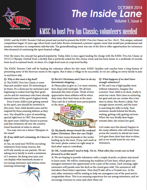 This newsletter is a joint publication of the KMSC Boosters and KMSC coaches. We welcome story ideas and anyone who may be interested in writing, editing, or designing. Contact us at [email protected].
