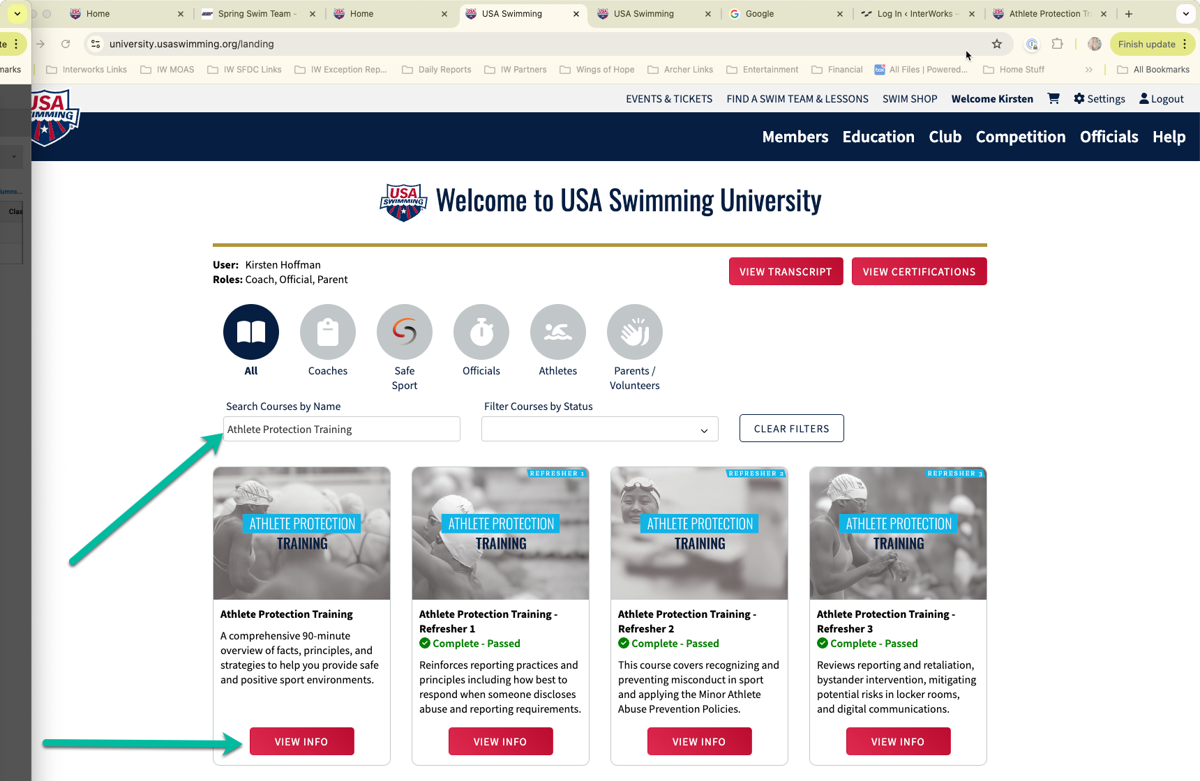 Type Athlete Protection Training in the Search Courses by Name Search Tab, and then Click on the View Info Button of the course that appears first in the menu below