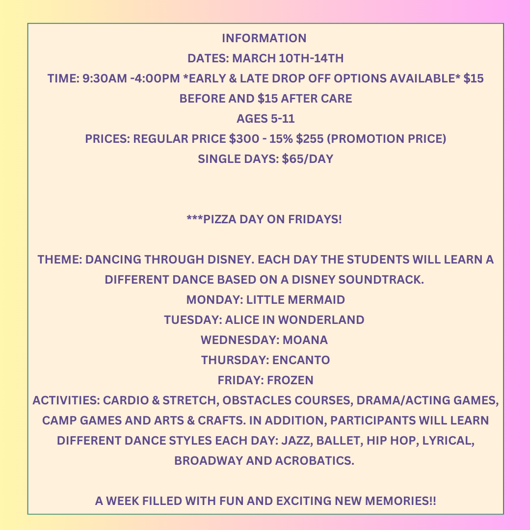 - Dancing & Acrobatics (Hip Hop, Contemporary, Musical Theatre, Jazz & Lyrical)